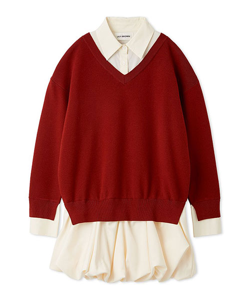 ニットプルオーバーとシャツワンピースをドッキングした、存在感のあるデザインワンピース。立体感のあるニットに、トレンド感漂うバルーンシルエットのスカートを合わせ、1枚で華やかなスタイリングが完成します。ゆったりとした着心地ながら、シャツ衿がほどよいきちんと感を添えるため、カジュアルにもきれいめにも対応可能。モードとフェミニンを絶妙にミックスしたシルエットで、デイリーから特別なシーンまで幅広く活躍します。