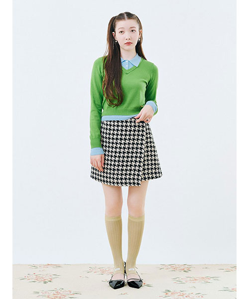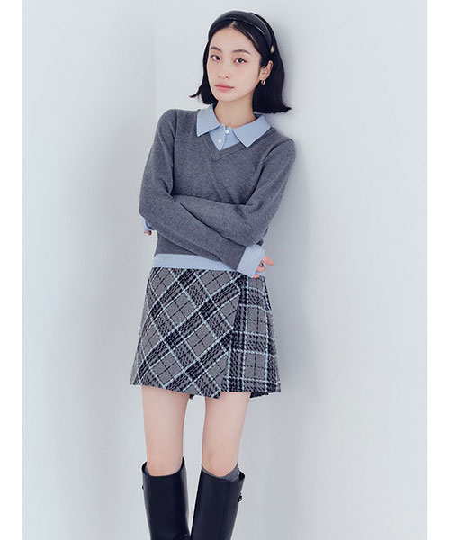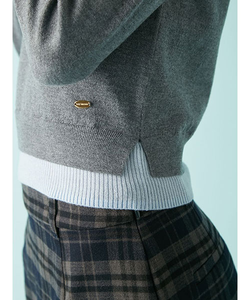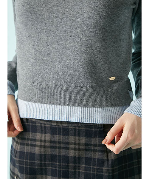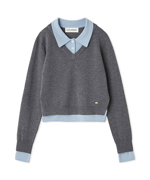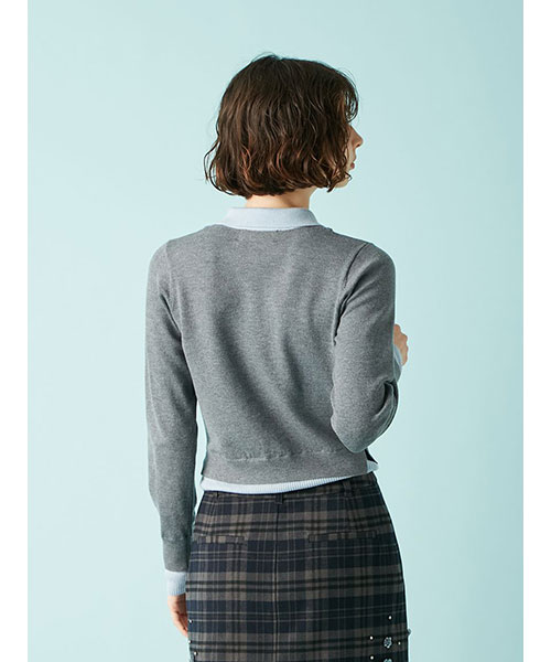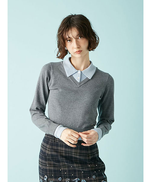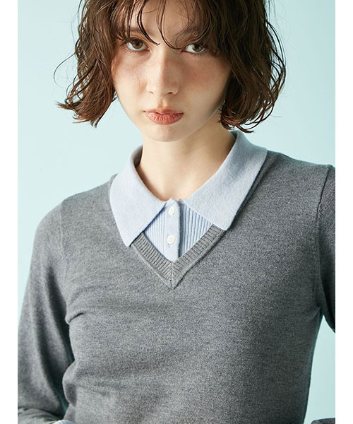 衿付きのニットとVネックプルオーバーを重ねたようなレイヤード風のルックスが目を引くニット。衿・袖口・裾の配色部分は、さりげなく編地を切り替えており、細部まで工夫を凝らした立体的な仕上がりに。ブランドらしいカラーコンビネーションが映える一方で、全体のシルエットはミニマルにまとめており、パンツにもスカートにも合わせやすく、幅広い着こなしが楽しめます。