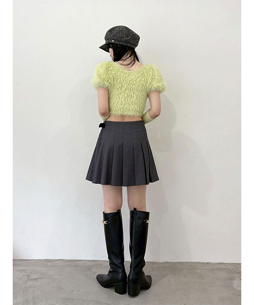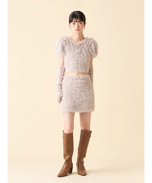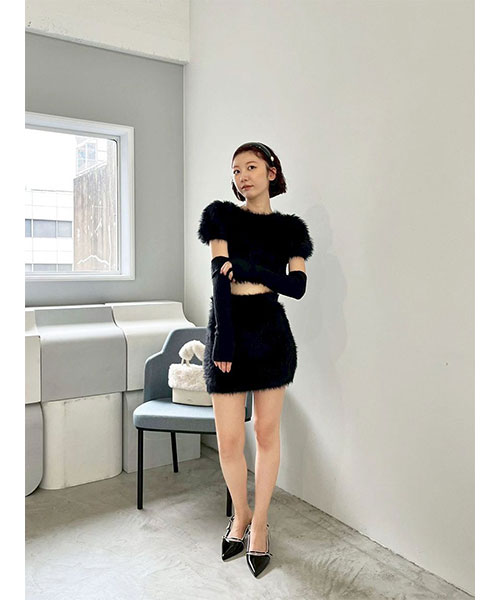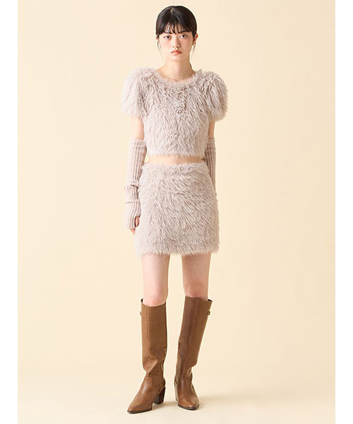 半袖ニットとアームウォーマーがセットになった、着映え力抜群のアイテム。パフスリーブでフェミニンな印象を与えつつ、袖丈と着丈はやや短めに設定し、すっきりとしたシルエットに仕上げました。アームウォーマーはクシュッとたるませたり、伸ばして二の腕をのぞかせるなど、アレンジ次第で異なる表情を楽しめます。同素材のフェザーヤーンミニスカート(LWNS254099)とセットアップでの着用もおすすめです。