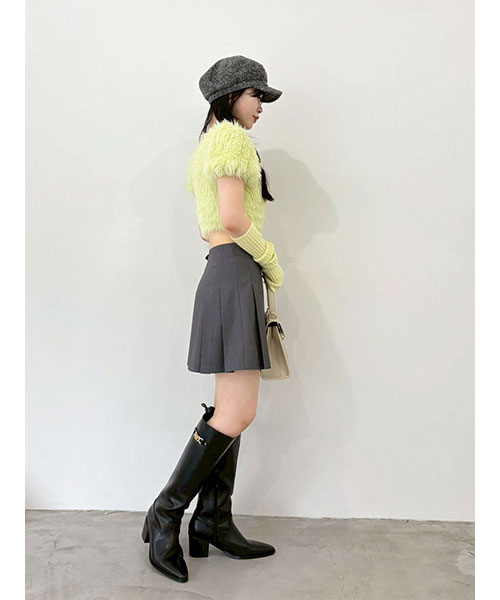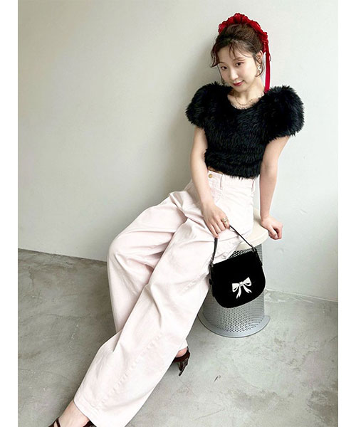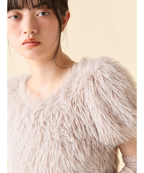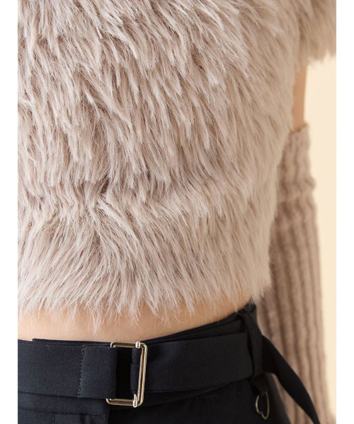 ファーのような表情を持つフェザーヤーンニットを使用。ふんわりとした柔らかさで、肌あたりも心地よく、秋冬にぴったりの一着です。