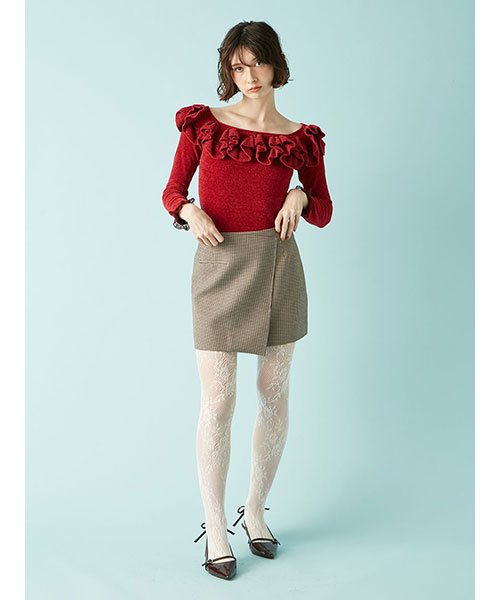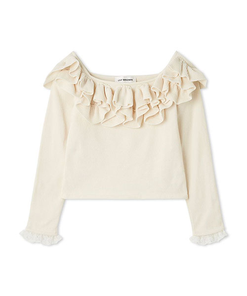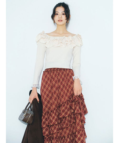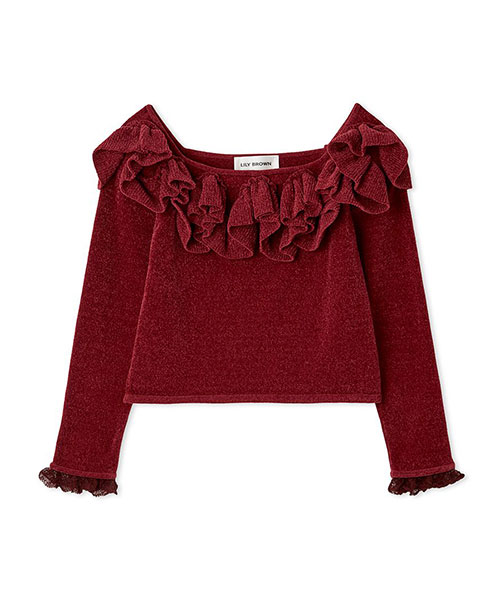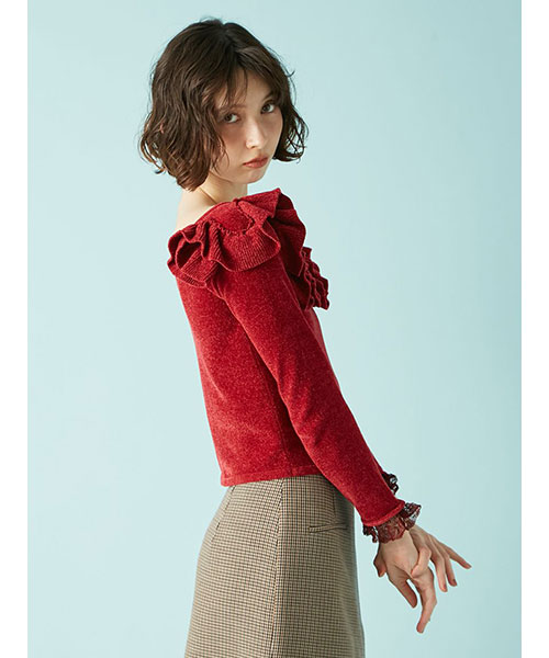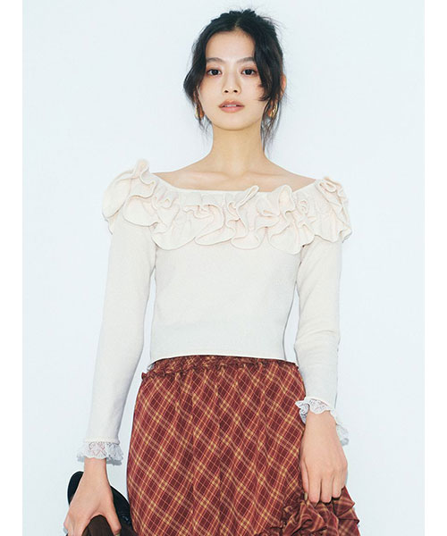 やわらかく温かみのあるモール糸を使用した、1枚で主役になるフリルニットトップス。デコルテを美しく見せるネックラインに、大胆なフリルをフロントから肩にかけてあしらい、華やかで印象的な一着に仕上げました。袖口には細番手の糸で編んだ繊細なフリルレースをドッキングし、よりフェミニンなムードを演出。オフショルダーとしても着用可能で、スタイリングの幅が広がります。