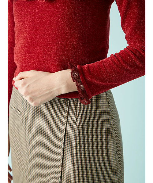 ふんわりと柔らかいモール糸をベースに、軽やかで優しい肌ざわりが魅力。袖口のフリル部分には異素材を組み合わせることで、奥行きのある表情に仕上げています。