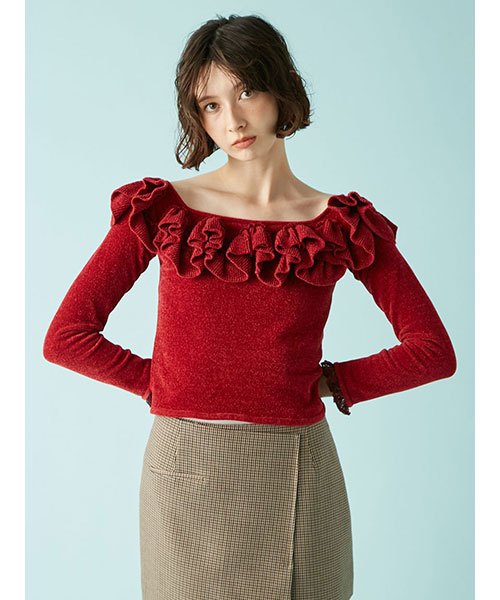 やわらかく温かみのあるモール糸を使用した、1枚で主役になるフリルニットトップス。デコルテを美しく見せるネックラインに、大胆なフリルをフロントから肩にかけてあしらい、華やかで印象的な一着に仕上げました。袖口には細番手の糸で編んだ繊細なフリルレースをドッキングし、よりフェミニンなムードを演出。オフショルダーとしても着用可能で、スタイリングの幅が広がります。