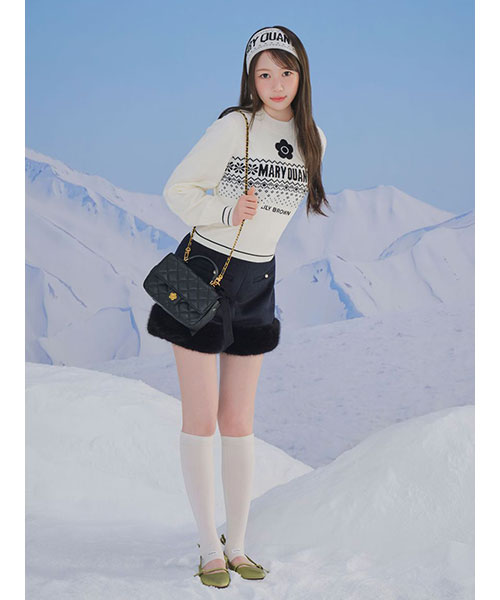 ウール混の上質な糸を使用し、柔らかな肌触りと保温性を確保。冬のスタイリングを彩るノルディック柄に、MARY QUANTとのコラボレーションならではの華やぎをプラスしました。