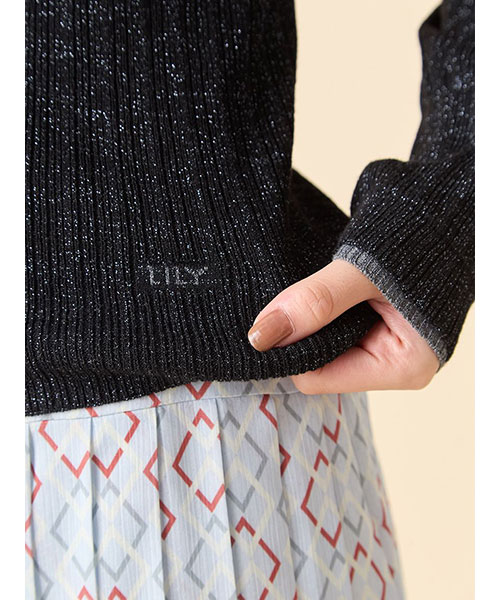 上品なラメ感が映える、洗練された印象のリブニット。ランダムなピッチの編み地が表情を生み出し、シンプルながらも奥行きのあるスタイルに仕上げました。袖口には配色のレイヤード風ディテールをプラスし、一枚で着用しても着映えるデザインに。裾には「LILY」の刺繍を施し、見えないところにもこだわりを。今季らしいカラーバリエーションで、コーディネートの幅も広がります。
