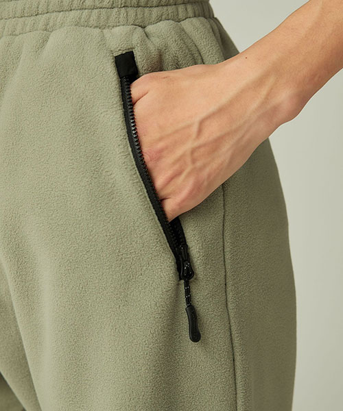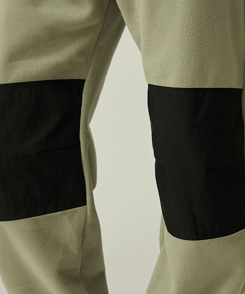 厚みのある両面起毛リサイクルフリースを使用し、膝当て布には摩擦に強いタッサー素材を採用。ウエストは締め付けの少ないゴム&丸紐で調整し、前開きファスナーをつけています。なので平紐を解く手間もありません。