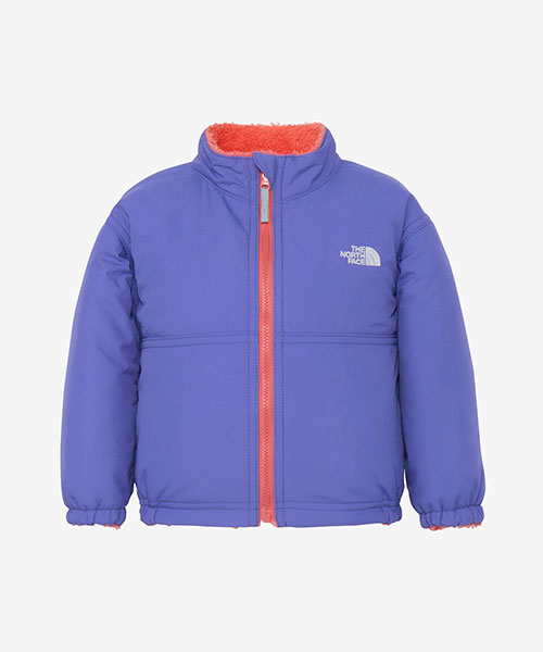 リバーシブルの薄中わた入りフリースジャケットのベビーモデル。フリース面は毛足のあるシェルパフリース、布帛面は軽量ではっ水性のあるリップストップナイロンを採用。