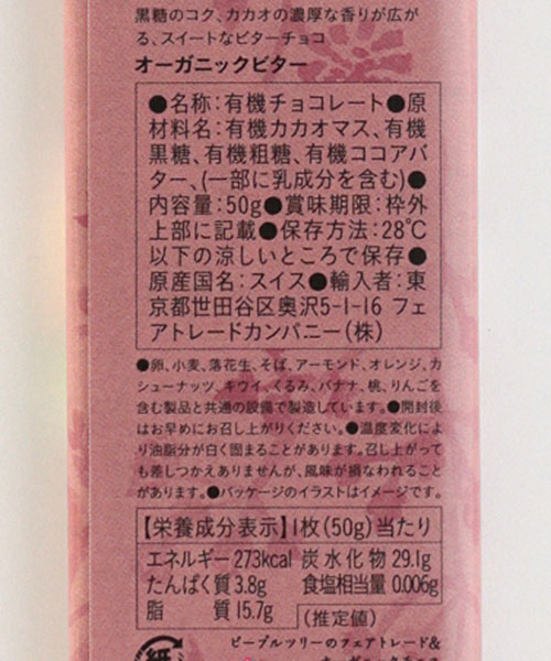 | 素材 | 有機カカオマス、有機黒糖、有機粗糖、有機ココアバター(一部に乳成分を含む) |