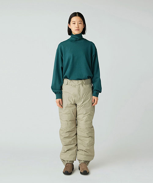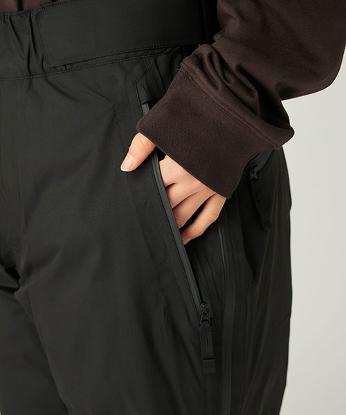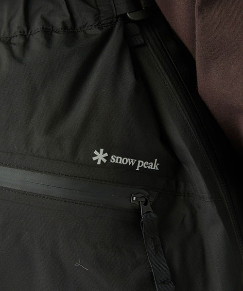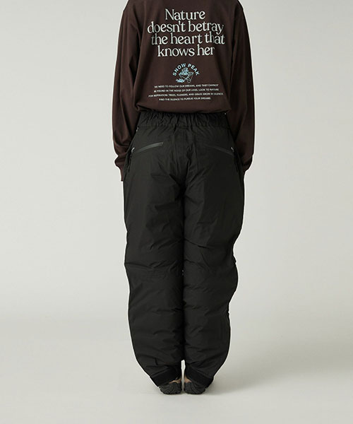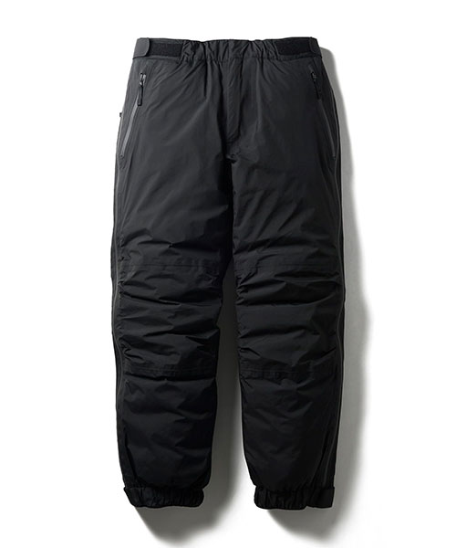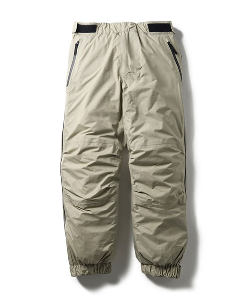 どんな極寒地でも対応できる保温力。「Snow Peak」アパレル史上最高峰スペックを誇るダウンパンツ。抜群の保温力と全天候に対応できる、完全防水仕様のハイスペックオーバーパンツです。ダウンアイテムでありながら、縫い目にはフルシーム加工を施し、GORE-TEX®のレインアイテム同等の防水性を誇るのが魅力。すべてのファスナーにはYKKの止水ファスナー「アクアガード」を採用しました。左右の脇をフルオープン仕様にすることで、靴やブーツを脱がずにイージーに着脱できます。また、左右にベルクロを配置し、フィット感も細かく調整可能。両脇には手を温められるように、袋布に起毛素材を用いたウォームポケットを装備しました。後ろ側には、出し入れしやすい角度のファスナーポケットを配置。裾には、風や冷気の侵入を防ぐベルクロを搭載しています。