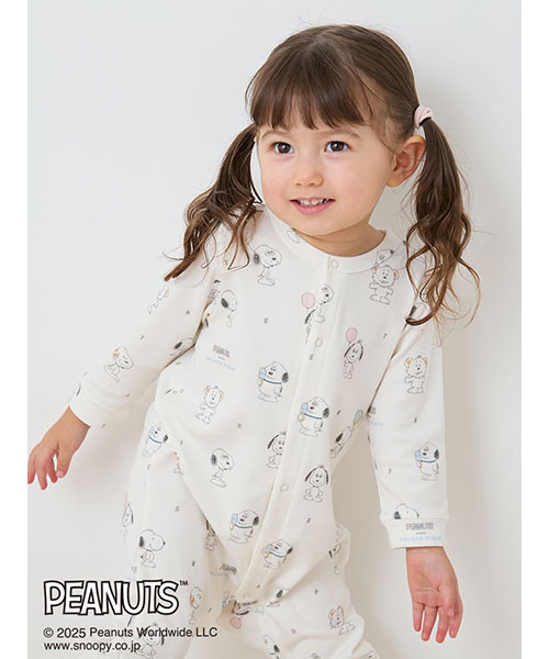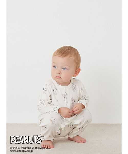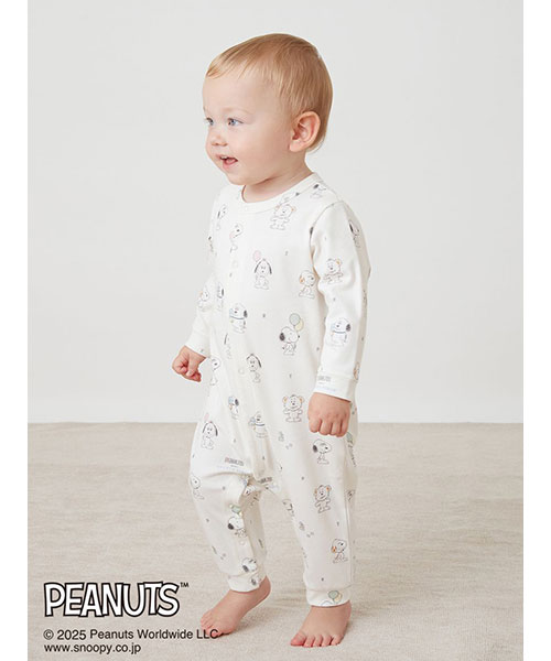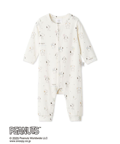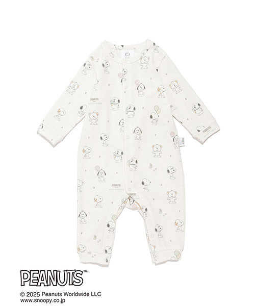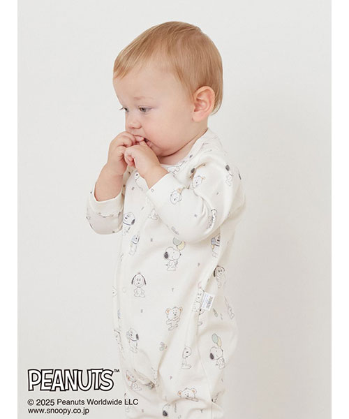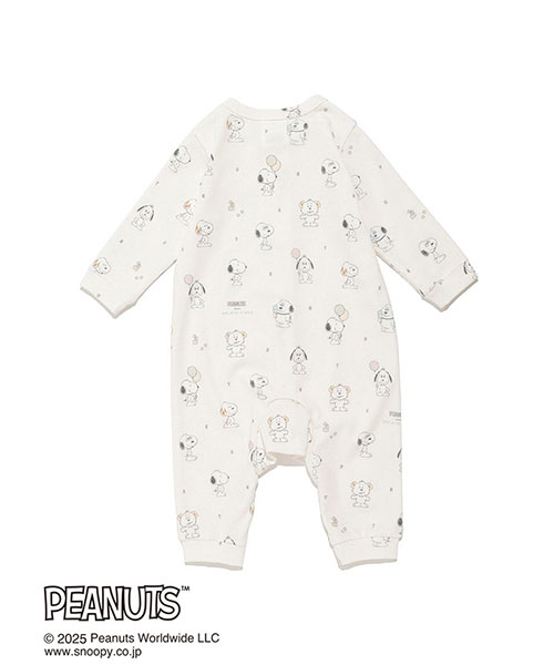 スヌーピーと仲間たちが、カラフルなおもちゃで遊んでいる絵柄をプリントしたBABYサイズのロンパース。