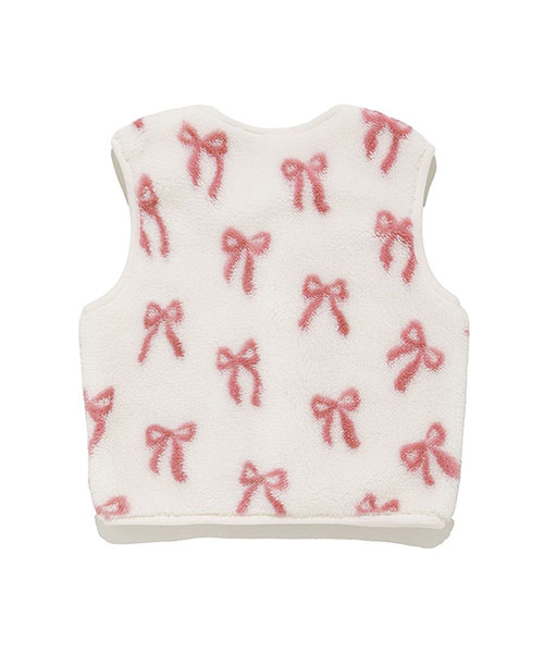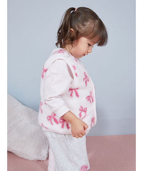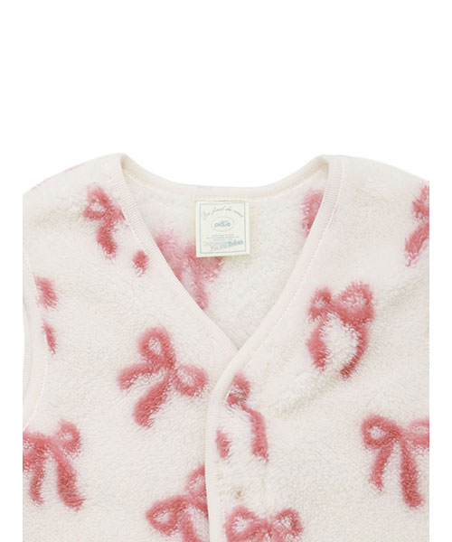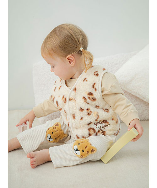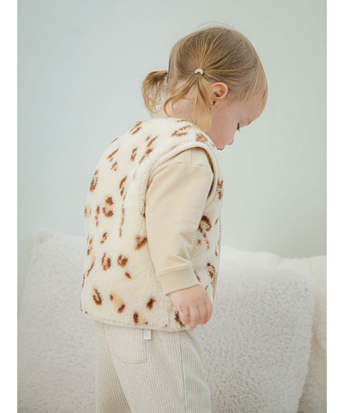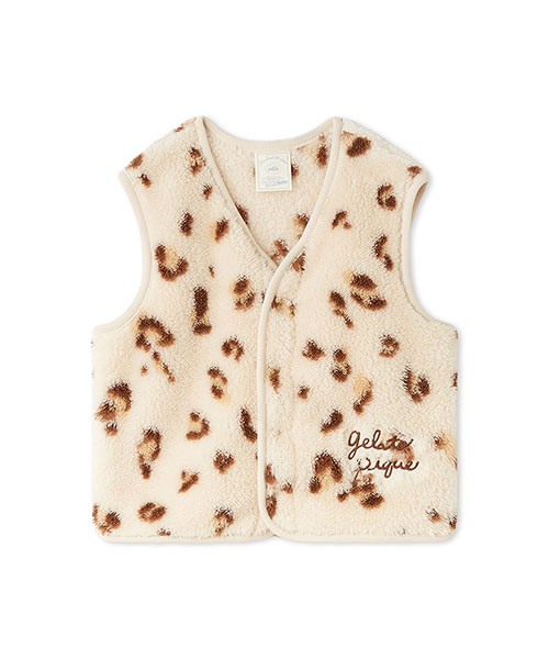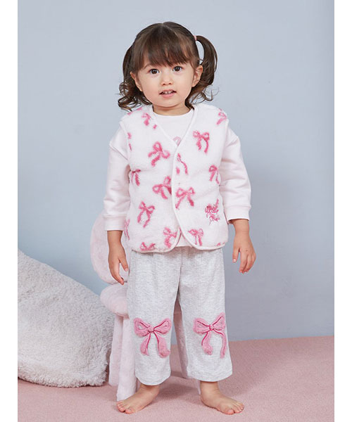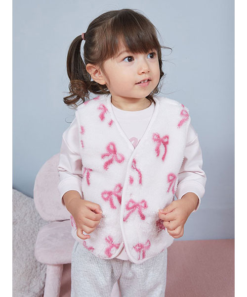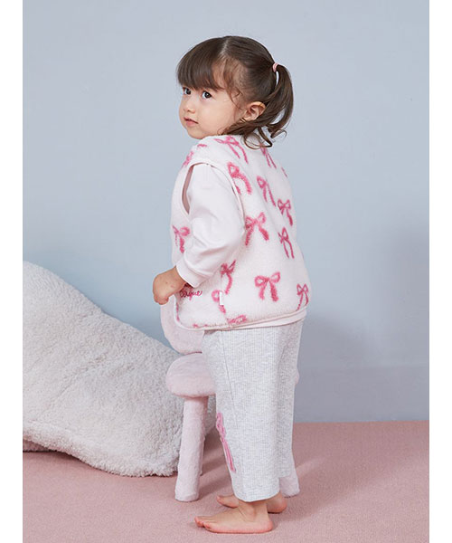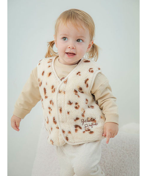 リボン、クルマ、ヒョウ。子どもたちがときめくモチーフをあしらった、ギフトにもおすすめしたいBABYシリーズです。ふっくら温かな風合いのフリース素材を使用した、お外にも着用していただけるベスト。汗をかきやすいお子様でも温度調整をしやすく、動きやすい羽織りです。スナップボタンでさっと着脱可能で、左腰にロゴ刺繍も入れました。色はリボン柄のピンク、クルマ柄のブルー、ヒョウ柄のベージュの3色展開。同シリーズのアップリケパンツやワンポイントプルオーバーを合わせたり、KIDSサイズとのリンク・コーディネートもお楽しみいただけます。