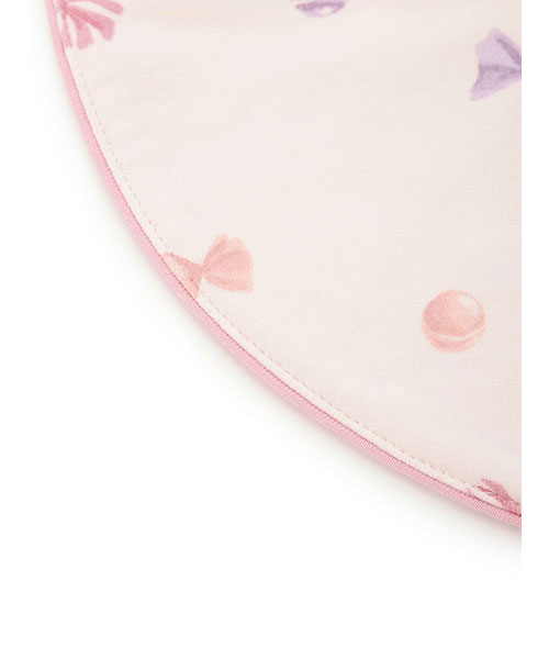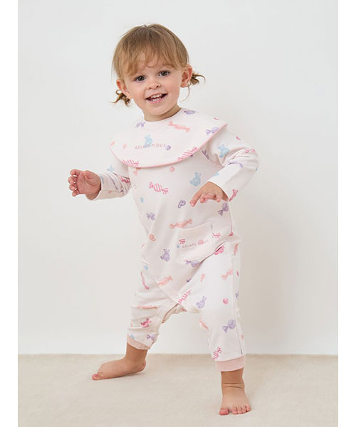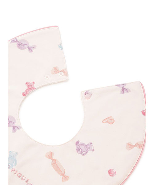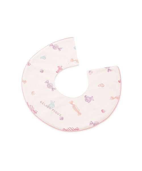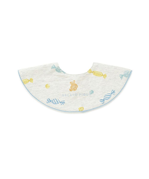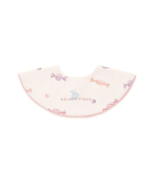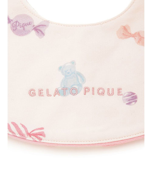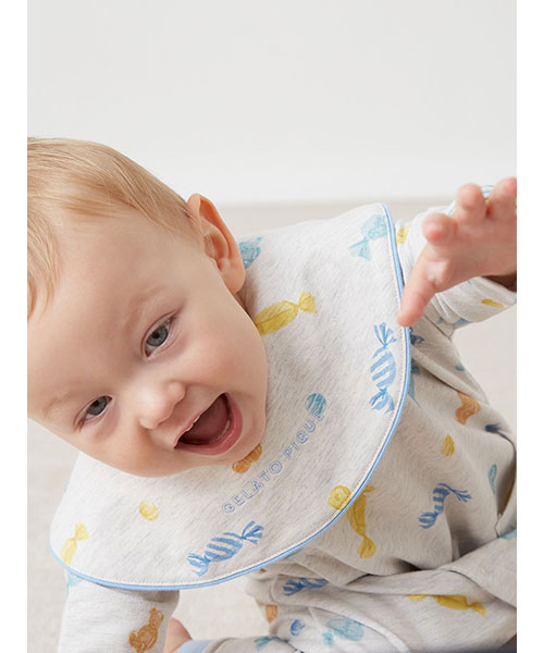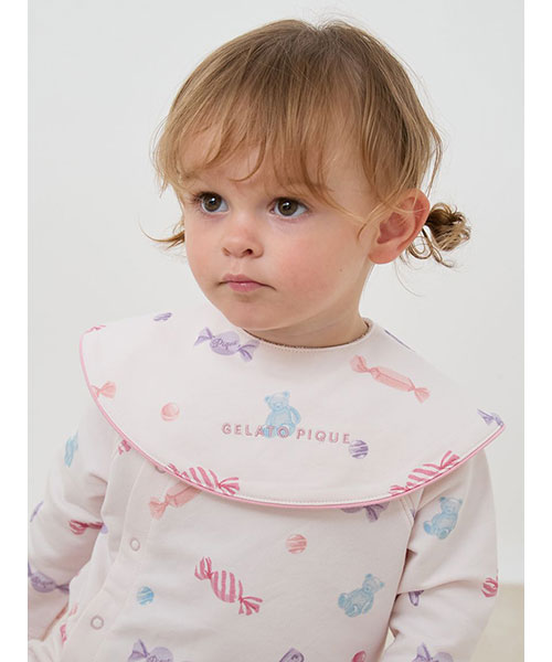 gelato piqueらしいベアやロゴモチーフのカラフルなキャンディを散りばめた、HAPPYな総柄プリントのBABYスタイです。柔らかく適度な厚みのあるコットン混のインレイ素材を使用。フロントにワンポイントで刺繍を入れ、縁に配色のパイピングを付けました。同シリーズのルームウェアや小物と組み合わせて、ギフトにもおすすめのアイテムです。