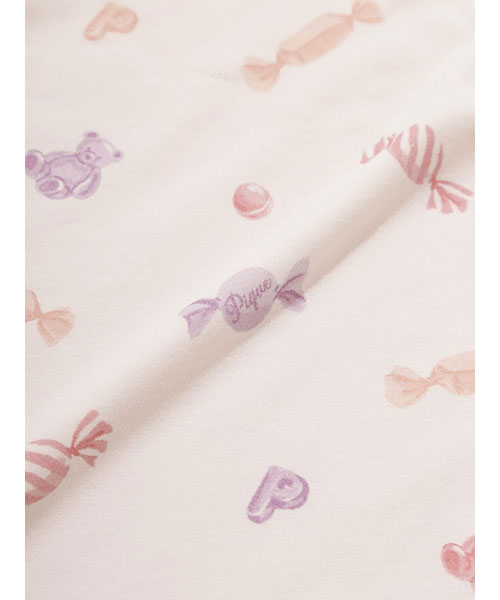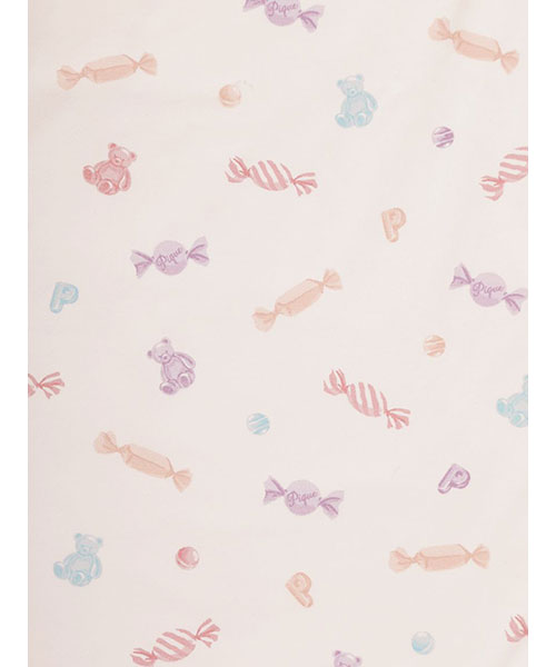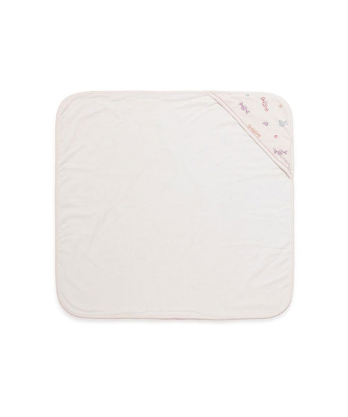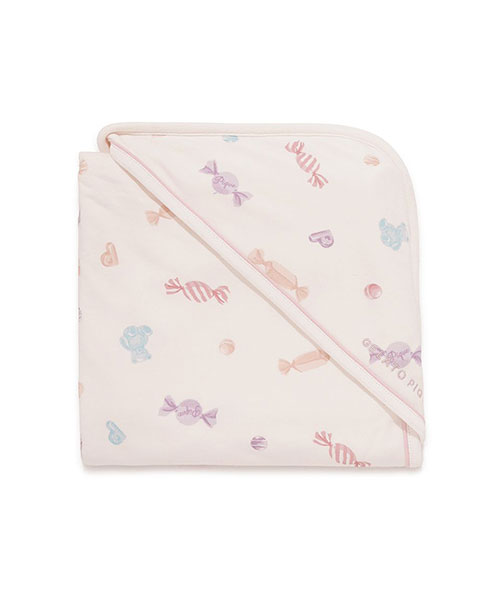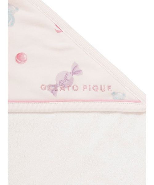 gelato piqueらしいベアやロゴモチーフのカラフルなキャンディを散りばめた、HAPPYな総柄プリントのBABYブランケットです。柔らかく適度な厚みのあるコットン混のインレイ素材を使用。フード付きなので室内でのお昼寝にはもちろん、お出かけにもご使用いただけます。フード部分にワンポイントで刺繍を入れ、縁に配色のパイピングを付けました。同シリーズのルームウェアや小物と組み合わせて、ギフトにもおすすめのアイテムです。