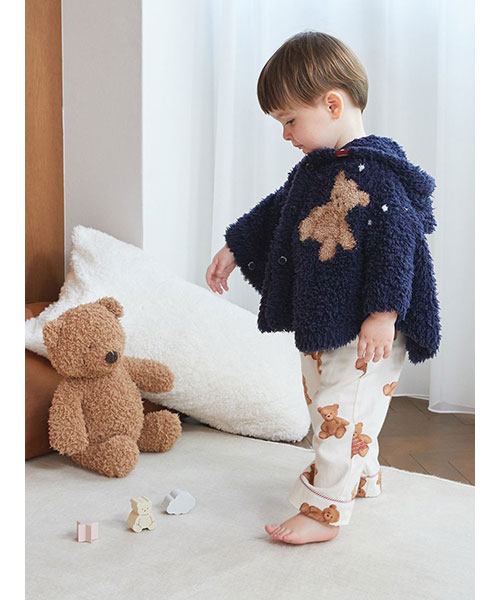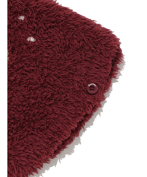 家族や友人、大切な誰かと過ごす温かなホリデーシーズンに寄り添う、スノーベアシリーズのBABYポンチョです。毛足の長い‘ジェラート’素材を使用した、ふんわり可愛いシルエット。フードにベア耳が付いているのがポイントです。フロントには座っているベアとその周りに舞っている雪をジャガードで表現し、背中には大きくサガラ刺繍のロゴも入れました。襟の内側には、キャンディケーンの柄をさりげなく配して季節感を出しています。色はレッド、ネイビーの2色をご用意。同シリーズのベア柄ネルシリーズや小物とコーディネートしたり、LADIES’、HOMME、KIDSサイズとのリンク・コーディネートもおすすめです。