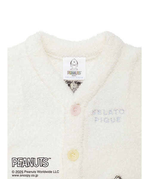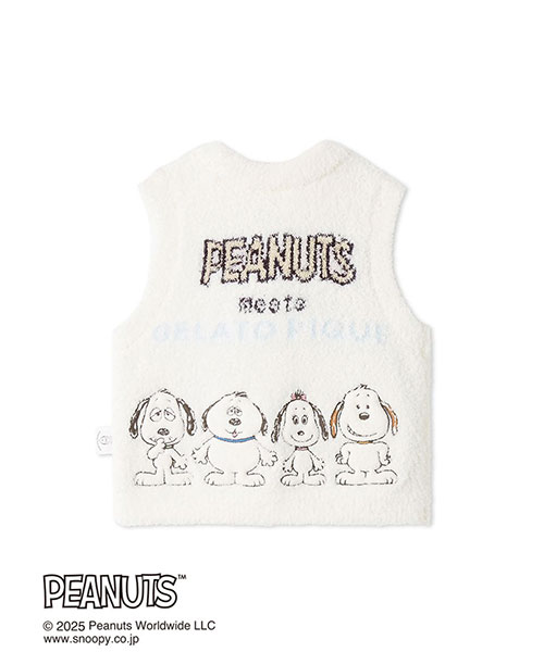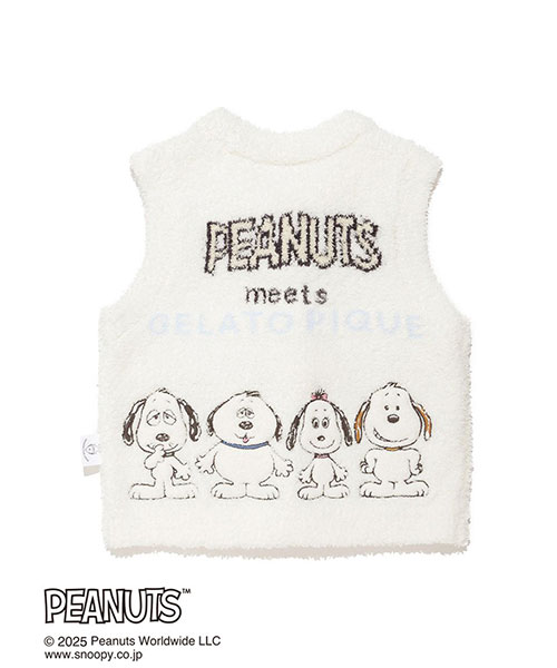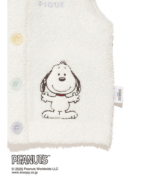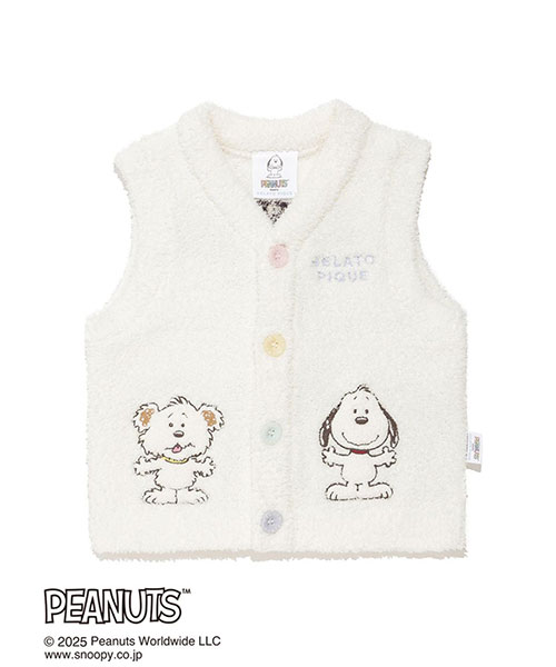 スヌーピーときょうだいたちの絵柄が大集合した、ふんわり軽い’ベビモコ’素材のBABYベスト。フロントにはスヌーピーとアンディ、背面にはスパイク、オラフ、マーブルス、ベルの4匹がアップリケ刺繍されています。