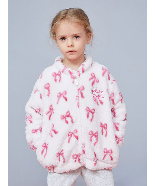 リボン、クルマ、ヒョウ。子どもたちがときめくモチーフをあしらった、ギフトにもおすすめしたいKIDSシリーズです。ふっくら温かな風合いのフリース素材を使用した、お外にも着用していただけるスタンドカラーブルゾン。重ね着しやすいゆとりのあるサイズ感で、胸元にロゴ刺繍を添えました。色はリボン柄のピンク、クルマ柄のブルー、ヒョウ柄のベージュの3色展開。同シリーズのアップリケパンツやワンポイントプルオーバー、小物類を合わせたり、BABYサイズとのリンク・コーディネートもお楽しみいただけます。
