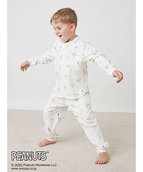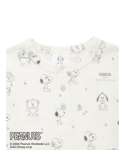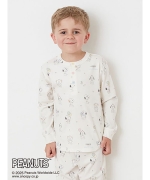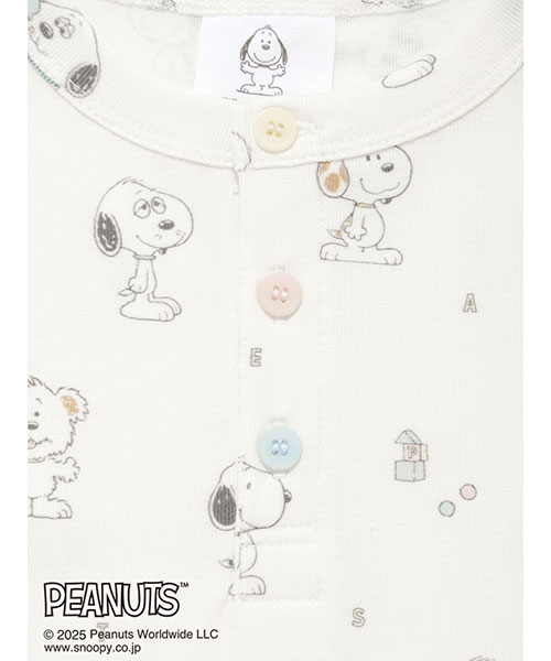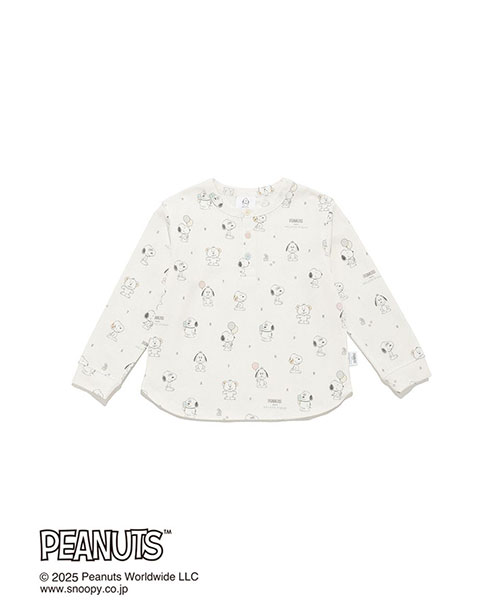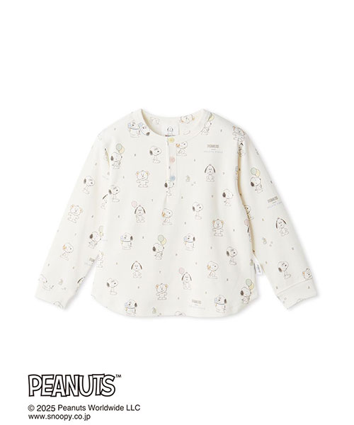 スヌーピーと仲間たちが、カラフルなおもちゃで遊んでいる絵柄をプリントしたキッズサイズのヘンリーネックプルオーバー。
