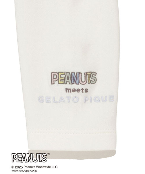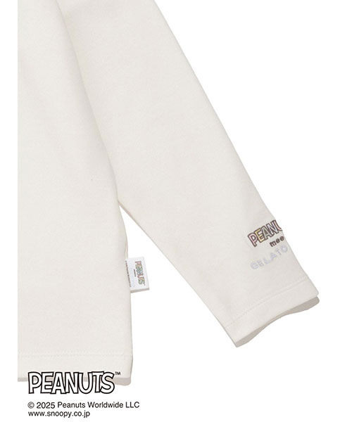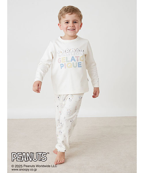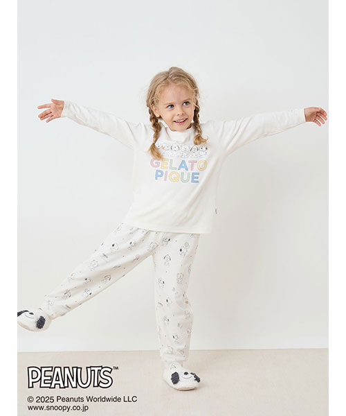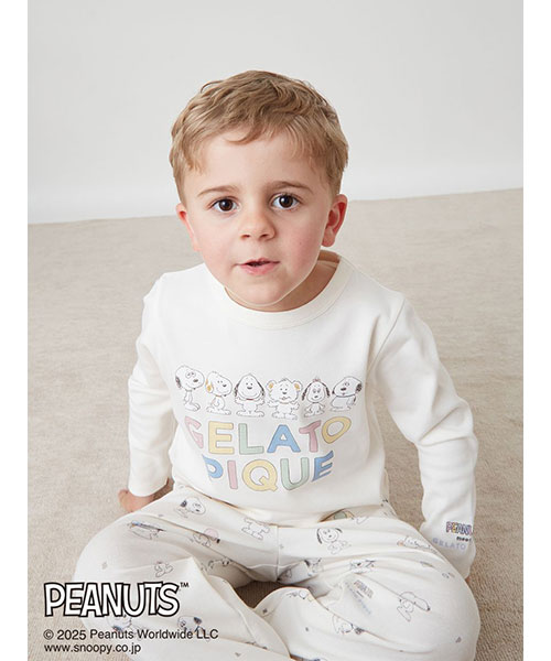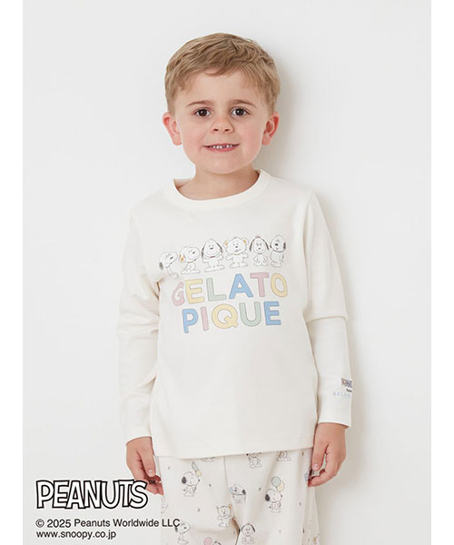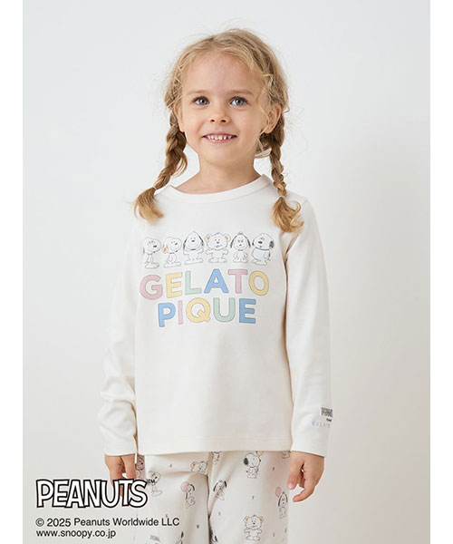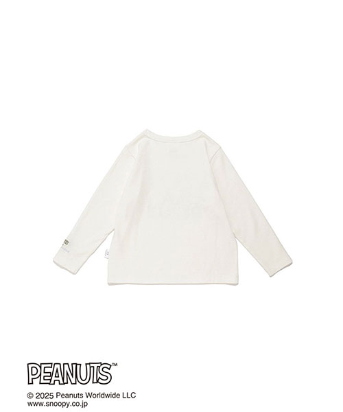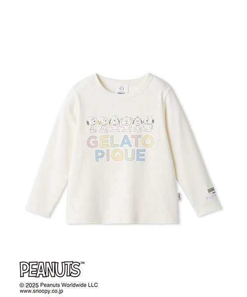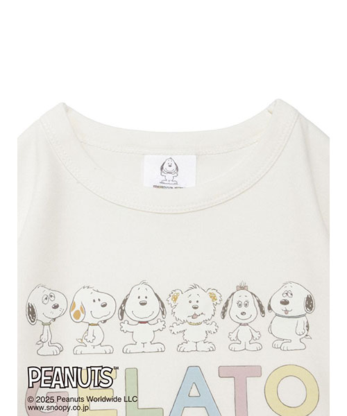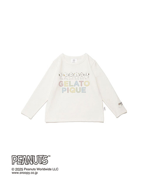 スヌーピーと仲間たちが並んだ絵柄に、カラフルなブランドロゴを組み合わせたキッズサイズのロングTシャツ。