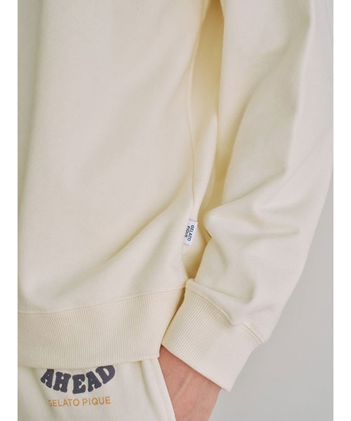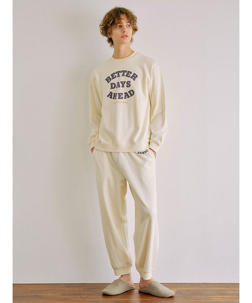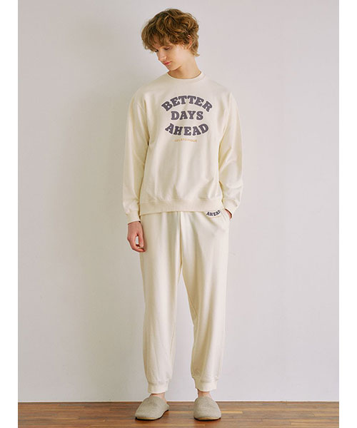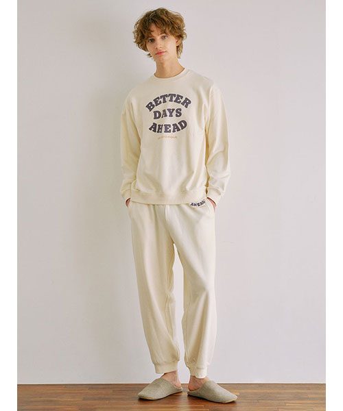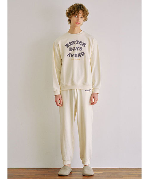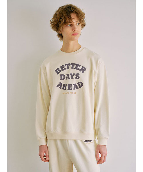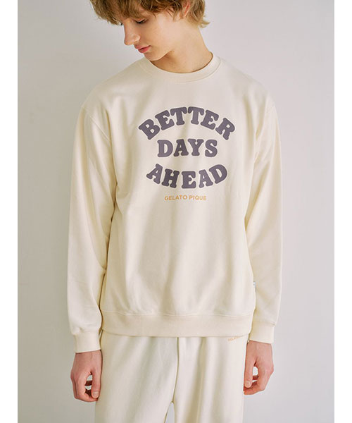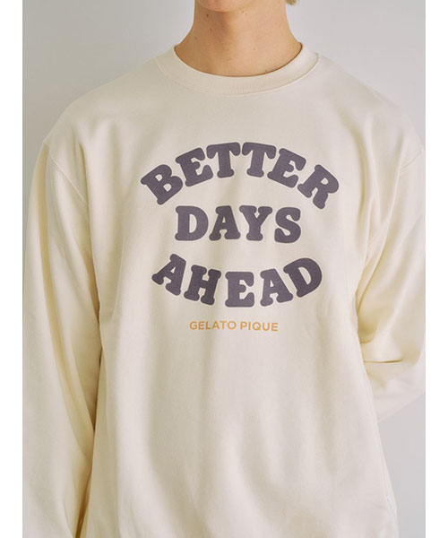 “BETTER DAYS AHEAD=より良い日々が待っている”という前向きなメッセージをプリントしたシリーズ。ベーシックなサイズ感のプルオーバーに、大きなロゴのフロッキープリントをフロントへ施しました。