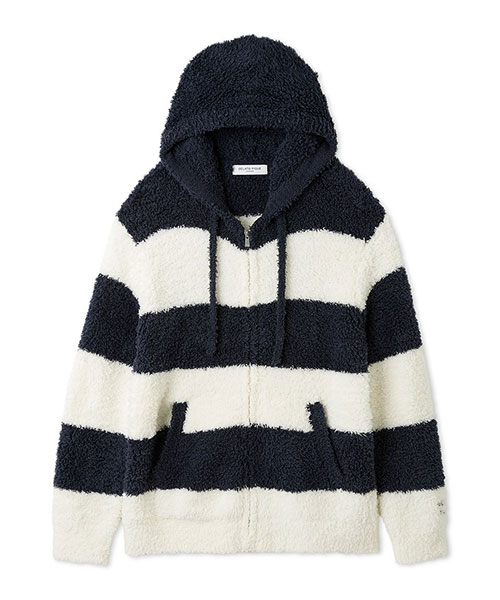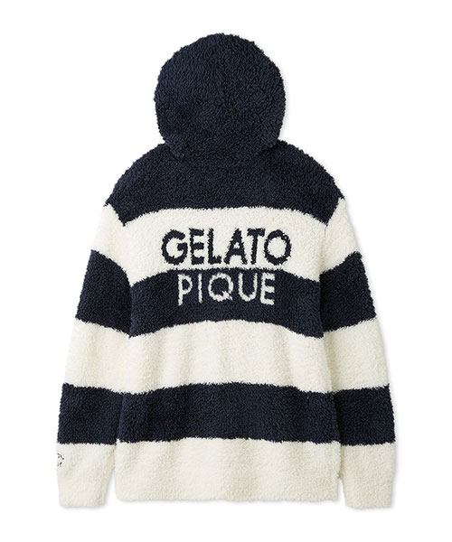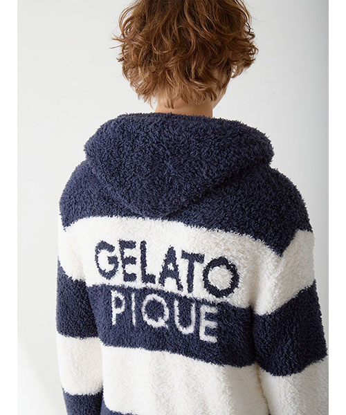 定番のもこもこ素材’シェラート’を使用した、アイコニックな2色ボーダー柄のHOMMEシリーズです。ゆるっとしたシルエットで重ね着しやすいジップパーカは、背中にGELATO PIQUEの大きなロゴジャガード入り。左袖口にはワンポイントでロゴ刺繍を入れました。同シリーズのロングパンツや小物と組み合わせてお楽しみいただけます。