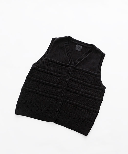 編み模様が楽しめる、Vネックのコットンベスト。フロントには小さなくるみボタンを並べ、シンプルながらも温かみのある雰囲気に。