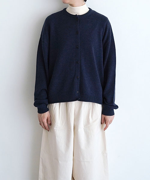 裾がくるんと丸まったロールヘム仕様が目を惹くニットカーディガン。コットンをベースに、ウールを程よくブレンドした生地は、柔らかさとあたたかみを兼ね備えた着心地です。