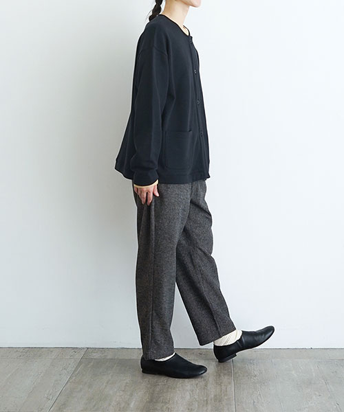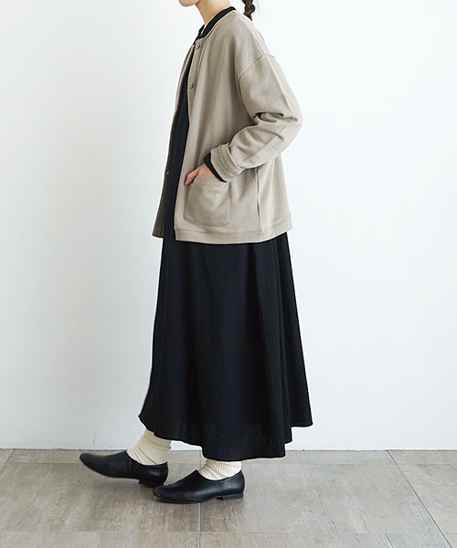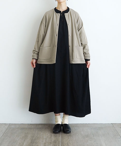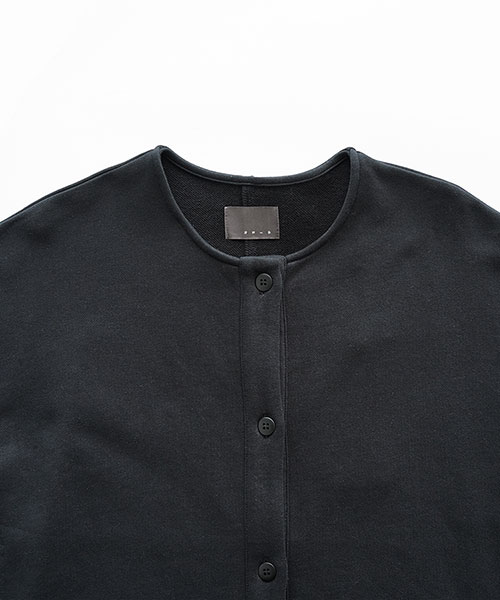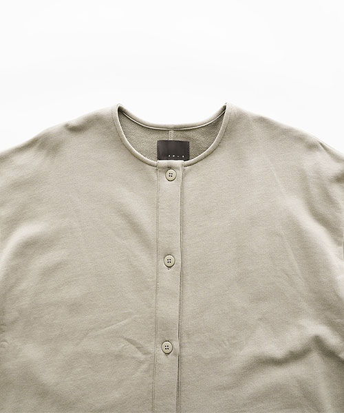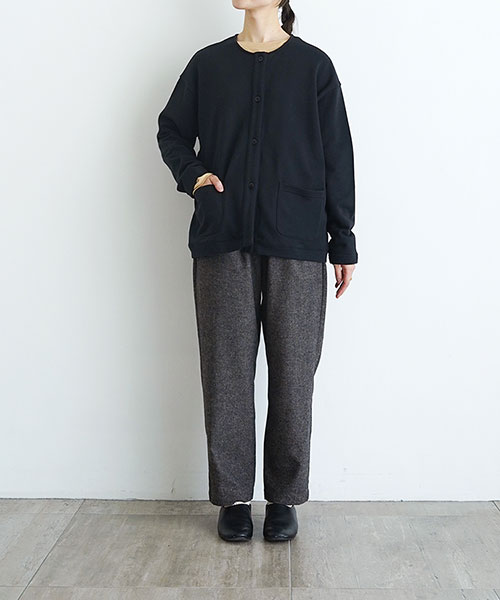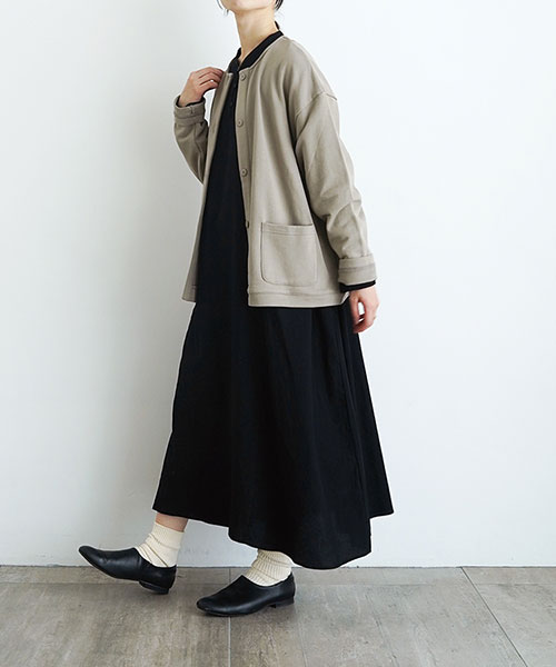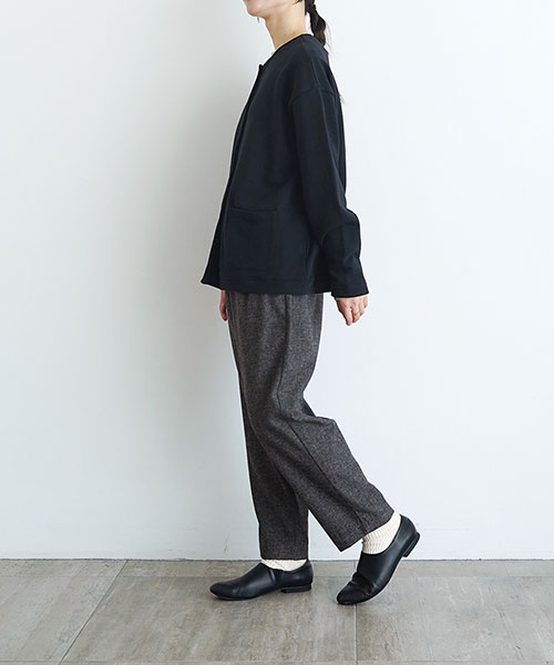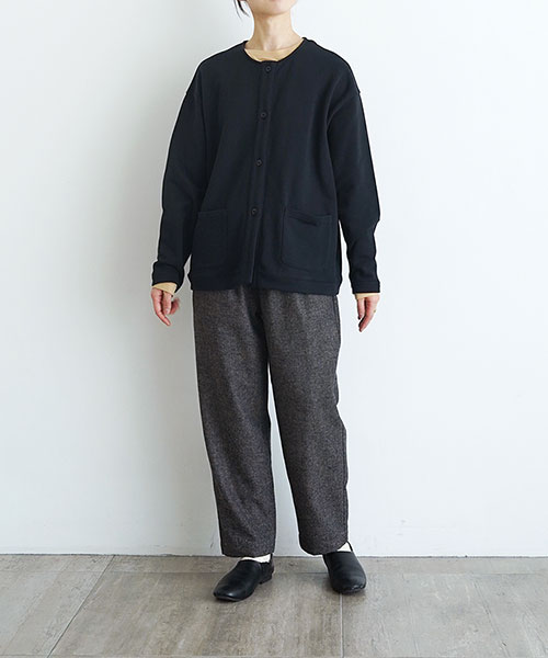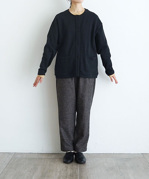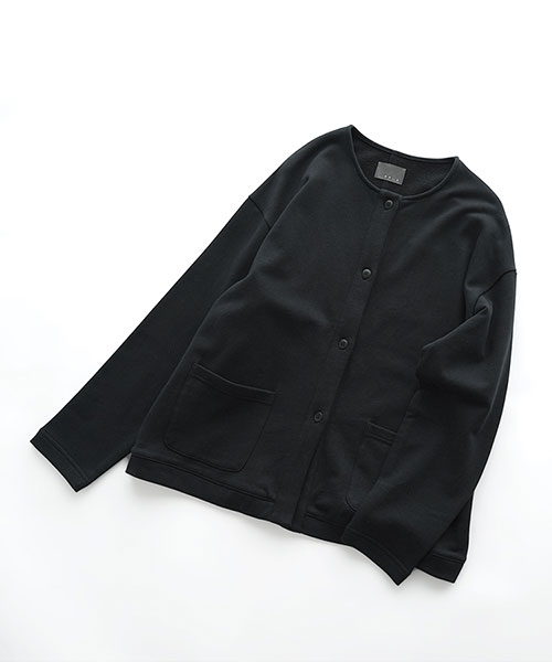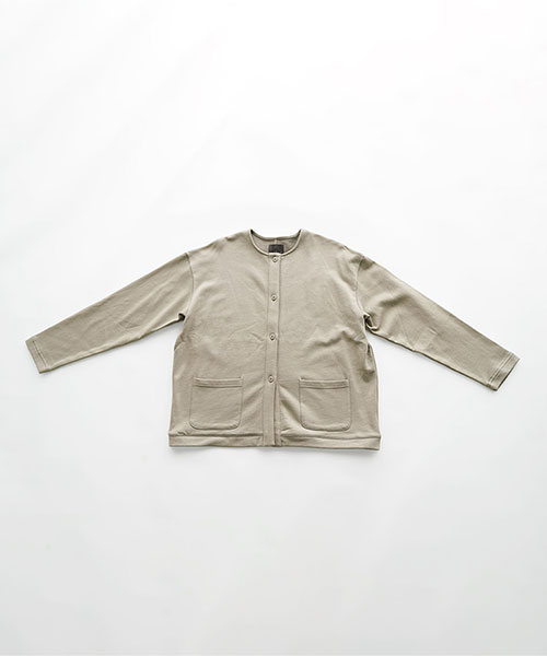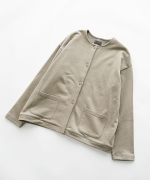 肌触りの良い、さらりとしたコットン生地のノーカラーカーディガン。バックスタイルは縦のラインがワンポイントに。