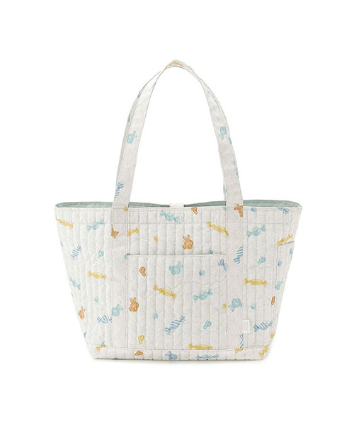 gelato piqueらしいカラフルなベアやロゴをモチーフにしたキャンディ柄を、ふっくらした手触りのキルティング素材にプリントしたママバッグです。マチありで荷物がたっぷり入るバッグは、本体内側と外側にスマートフォンやおもちゃなどをの小物を収納できる大小のポケットをたくさん付けました。裏地には抗菌防臭機能が付いた生地を使用しています。長めのハンドルで肩に掛けやすいのもポイント。同シリーズの母子手帳ケースやKIDS、BABY小物と組み合わせたり、ルームウェアとのリンク・コーディネートもお楽しみいただけます。