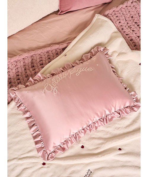 上品な光沢でなめらかな手触りのサテンピローケースにフリルをあしらったロマンティックなデザインのピローケースです。フロントには華やかなロゴとgelatopiqueらしいモチーフを刺繍で贅沢に散りばめています。色はアイボリー、ピンク、ブルーの3色展開。ギフトにおすすめな封筒型パッケージ付きで、ギフトアイテムのプラスワンにオススメです。