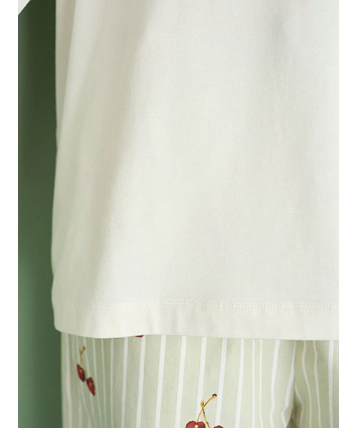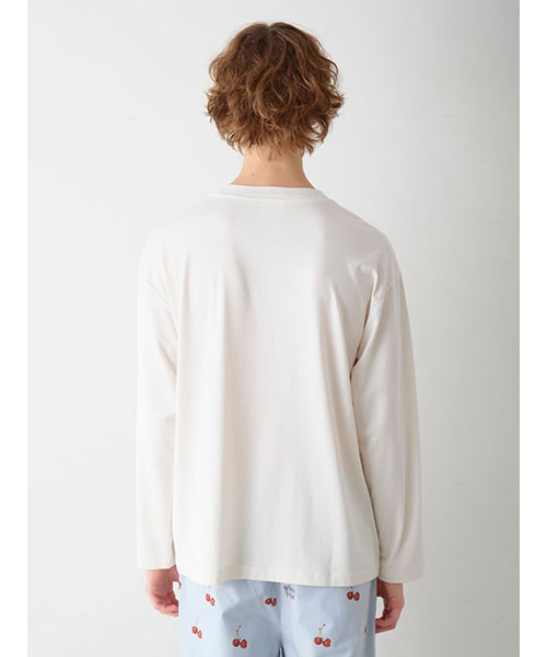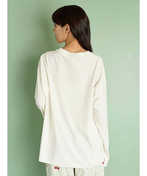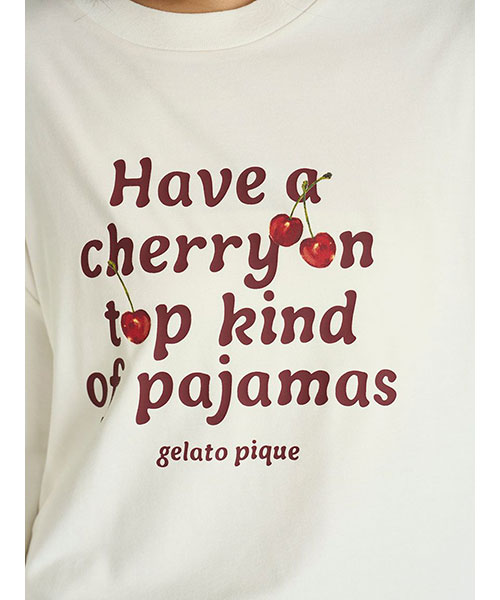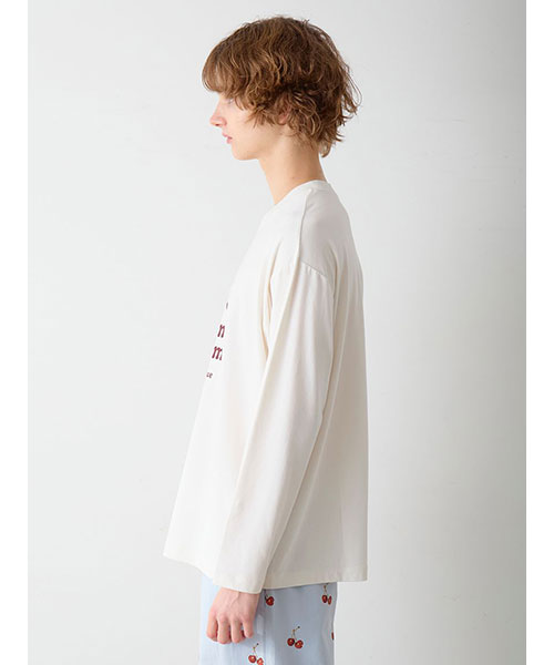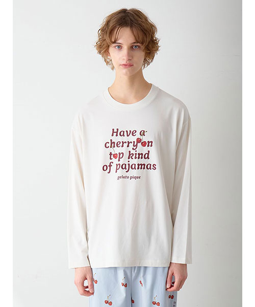 「チェリーをトッピングしたような、最高のパジャマを着る」といった意味のメッセージプリントを入れた、なめらかなUNISEXロングTシャツです。丸みのあるフォントに大人な色合いのチェリーを添えた、1枚でもインナーとしてもお楽しみいただけるデザイン。リラックス感のあるゆったりサイズで仕上げました。同シリーズのチェリー柄ロングパンツや、裏毛ハーフパンツとのコーディネートもおすすめ。UNISEXサイズなので、パートナーとのペア・コーディネートも可能です。
