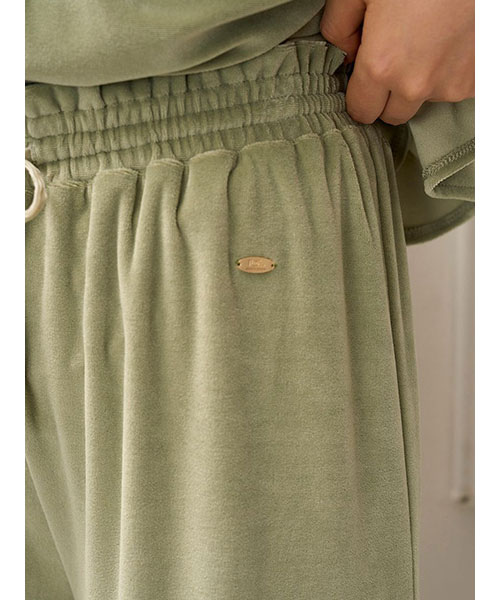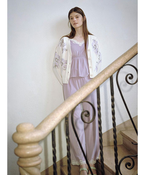 チェコの画家アルフォンス・ミュシャとgelato piqueによる優雅なコレクションが、この秋再び登場しました。今回のテーマは、ミュシャが表紙や挿絵を手がけた切ない恋物語『トリポリの姫君イルゼ』。作中に描かれたリリーをオリジナルのレースに仕立てて裾にあしらった、ヴィンテージライクなベロア素材のロングパンツです。裾にかけてややフレアに広がる上品なシルエット。ウエストにはフリルをあしらい、左腰にさりげなくゴールドのチャームを付けています。同シリーズのタンクトップとのセットアップがおすすめです。