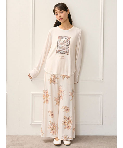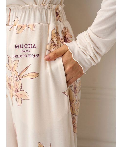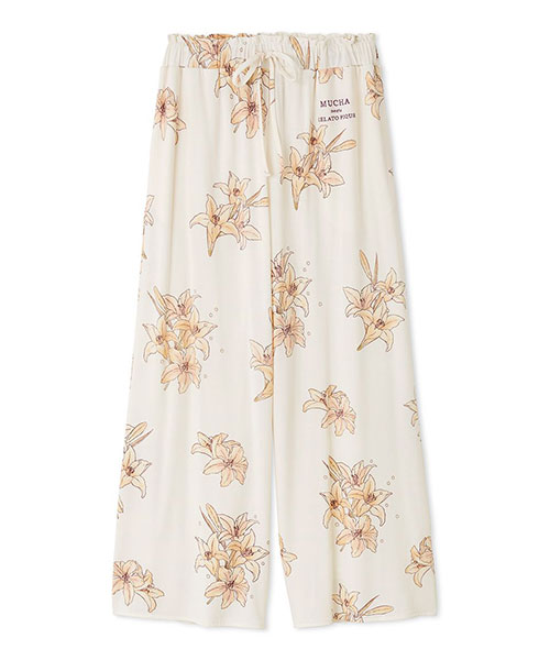 チェコの画家アルフォンス・ミュシャとgelato piqueによる優雅なコレクションが、この秋再び登場しました。今回のテーマは、ミュシャが表紙や挿絵を手がけた切ない恋物語『トリポリの姫君イルゼ』。淡いカラーリングのリリー柄をメインに、作品で共に描かれた小さなスター柄を組み合わせたロングパンツです。裾がフレアに広がる上品なシルエットで、左腰にWネームの刺繍も添えました。柔らかなカットソーなのでロングシーズンで着用していただけます。同シリーズのロンTやプルオーバーと合わせてお楽しみください。