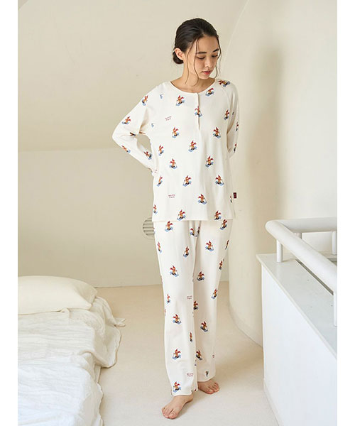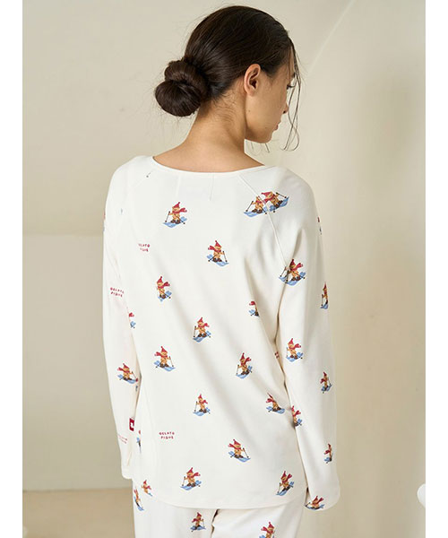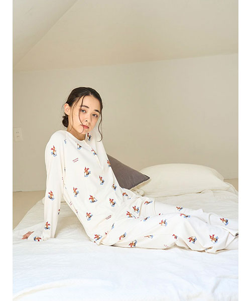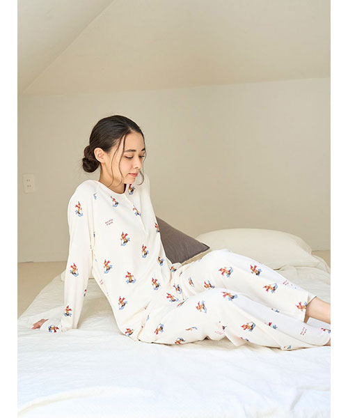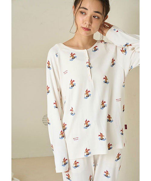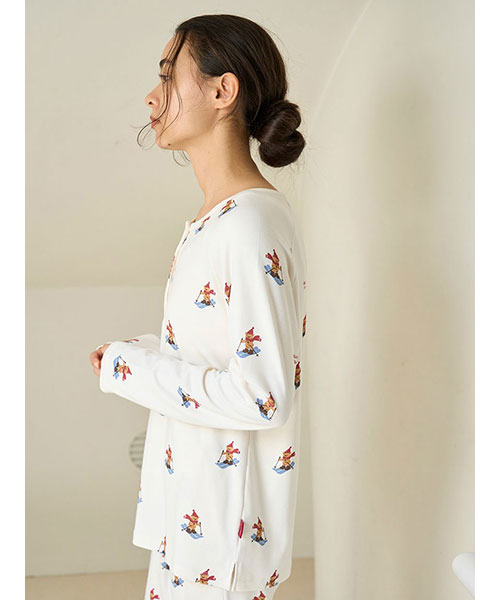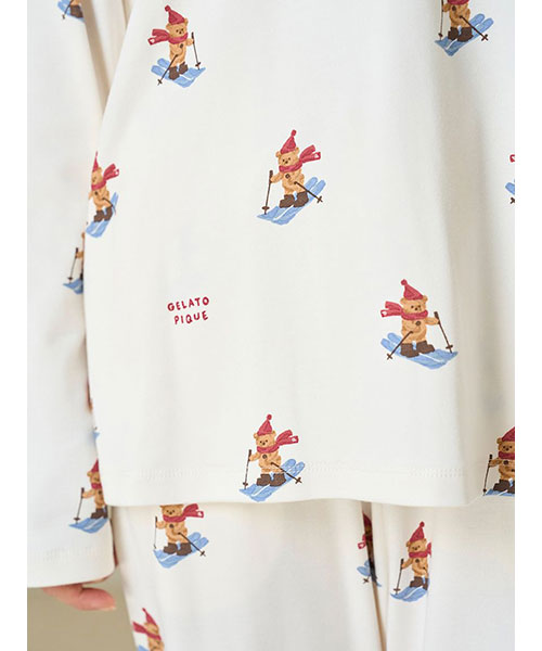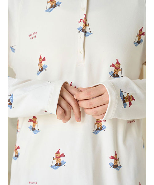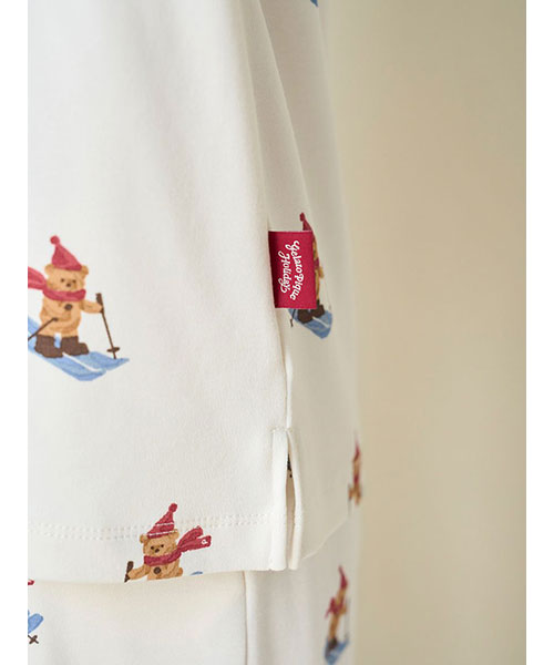 家族や友人、大切な誰かと過ごす温かなホリデーシーズンに寄り添う、ベアモチーフのルームウェアシリーズです。颯爽とスキーを楽しむベアを総柄プリントしたレーヨンのロングTシャツ。襟はトレンド感のあるヘンリーネックで、雪粒を連想させる小さめのボタンをあしらいました。柄にクリスマスを思わせる赤色を取り入れ、ネックラインやラグランスリーブの切り替え部分には温かみのあるステッチも添えています。同シリーズのロングパンツやスキーベアジャガードシリーズに合わせたり、HOMMEサイズとのペア・コーディネートもお楽しみください。