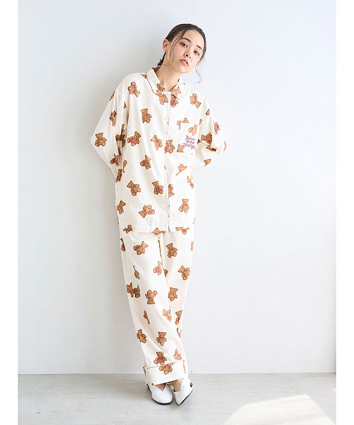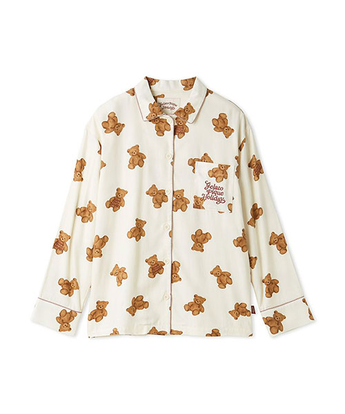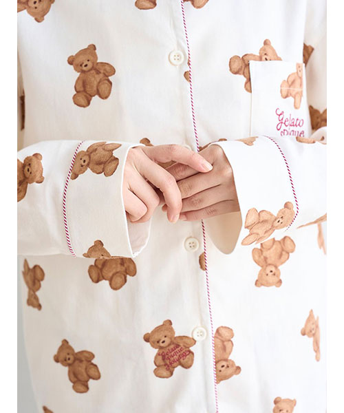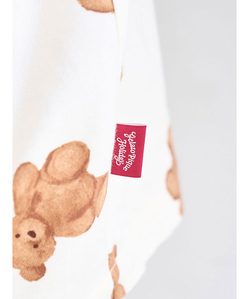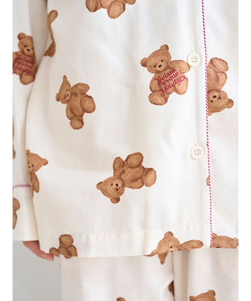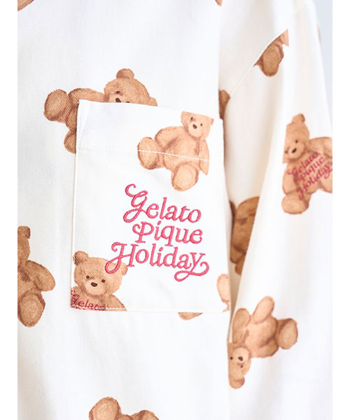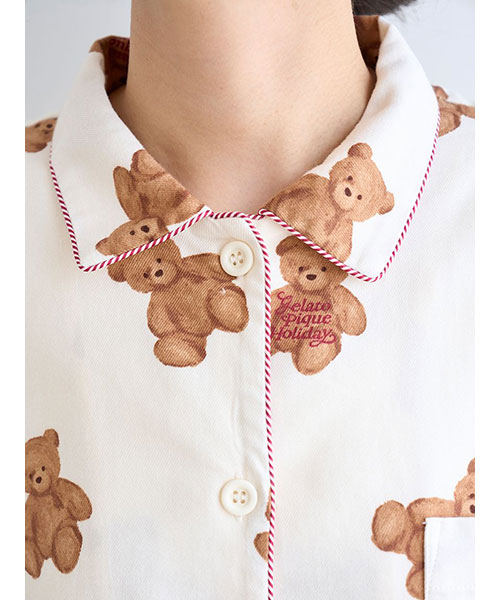 家族や友人、大切な誰かと過ごす温かなホリデーシーズンに寄り添う、ベアモチーフのルームウェアシリーズです。大きめのベアの総柄プリントが印象的な、温かみのあるネル素材のシャツパジャマ。襟元や袖口には、キャンディーケインをイメージしたボーダーのパイピングが入っています。gelato pique Holidayのロゴ刺繍が入った胸ポケット付き。色はアイボリーとネイビーの2色展開です。同シリーズのネルロングパンツとの組み合わせや、HOMME、KIDS、BABYサイズとのリンク・コーディネートもお楽しみいただけます。
