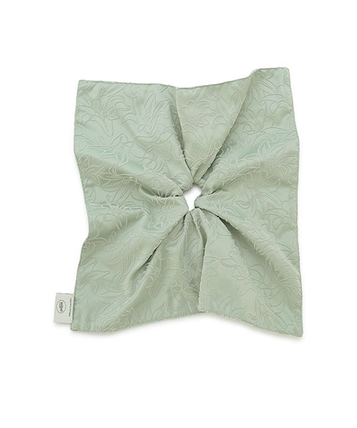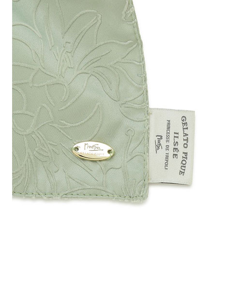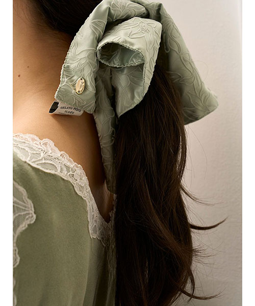 チェコの画家アルフォンス・ミュシャとgelato piqueによる優雅なコレクションが、この秋再び登場しました。今回のテーマは、ミュシャが表紙や挿絵を手がけた切ない恋物語『トリポリの姫君イルゼ』。作中に描かれたリリーの線画を、フロッキープリントで表現したサテン生地のビッグシュシュです。布地をたっぷりと使用しているので、髪を結んだ時にブーケのような上品な華やかさが出ます。ワンポイントでロゴ入りのプレートもあしらいました。色はヴィンテージ感あふれるグリーンとブラウンの2色展開。同シリーズのウェアとコーディネートしたり、雑貨と組み合わせてギフトにもおすすめのアイテムです。
