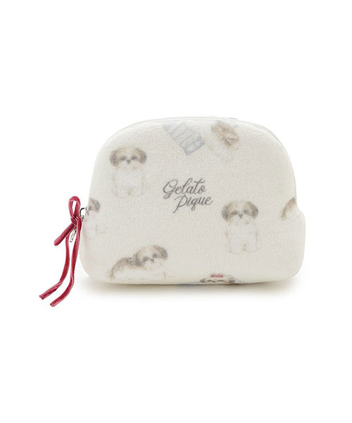 キュートなシーズーを描いたウェアシリーズと連動した小物シリーズです。シーズーのふんわり感をイメージしたパイル生地に、色々なポーズのシーズーの絵柄とロゴをプリントしたティッシュポーチ。引手には、シーズーが頭に付けているベロアリボンをあしらいました。背面にティッシュケースが付いたタイプで、コンパクトな見た目ながら基本のメイクアイテムがしっかり収納できるサイズ感。毎日のコスメポーチや旅行時の小物収納にもおすすめです。同シリーズのウェアや雑貨とコーディネートしてお楽しみください。