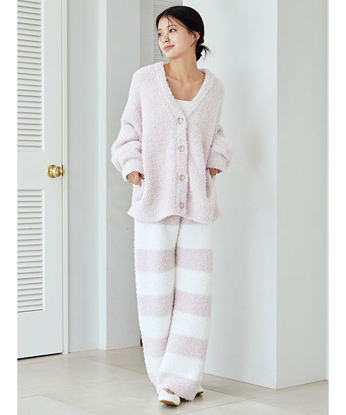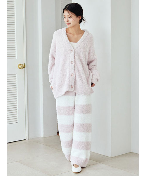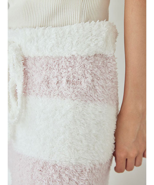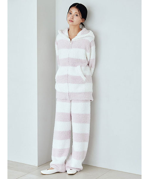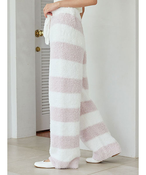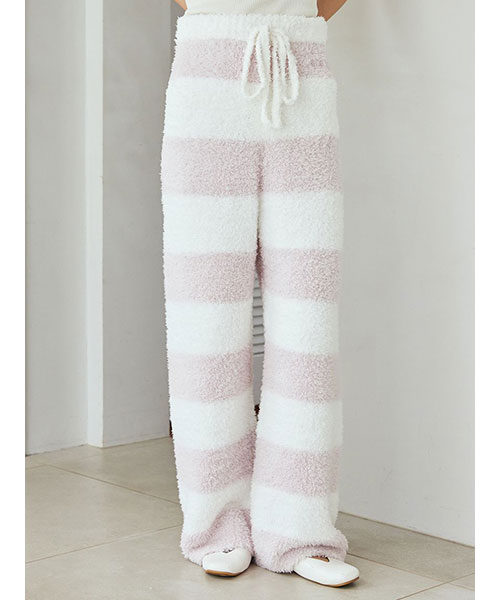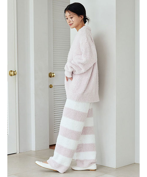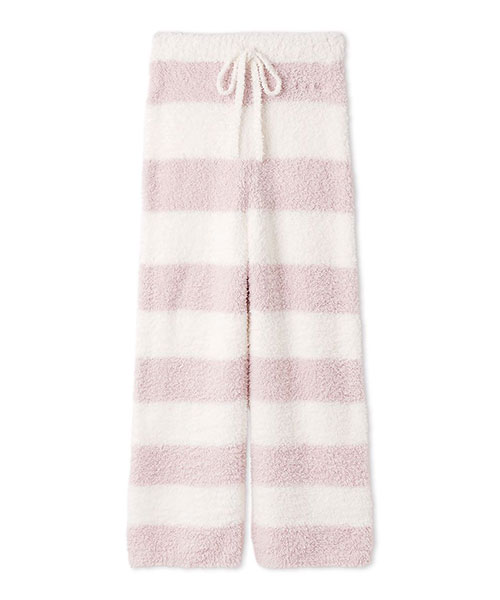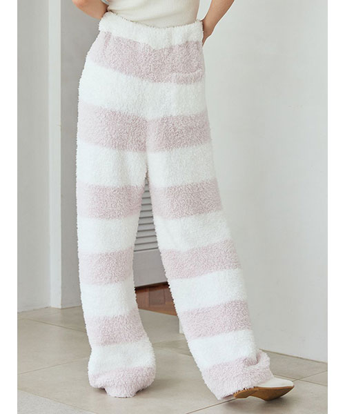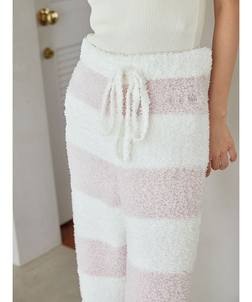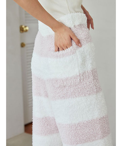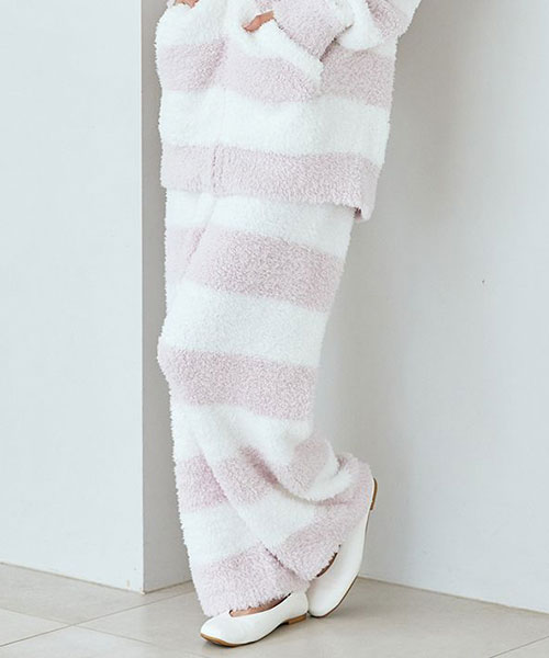 秋冬シーズンに似合うこっくりとした色合いで仕上げた、定番もこもこ素材‘ジェラート’の2色ボーダーシリーズです。足元までふっくらと包み込んでくれるストレートのロングパンツは、春先まで長くお楽しみいただけるアイテム。右後ろにポケット付きで、左腰にさりげなくロゴ刺繍が入っています。色はピンク、ブルー、モカの3色をご用意。同シリーズのパーカや小物と合わせてお楽しみください。