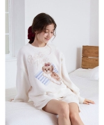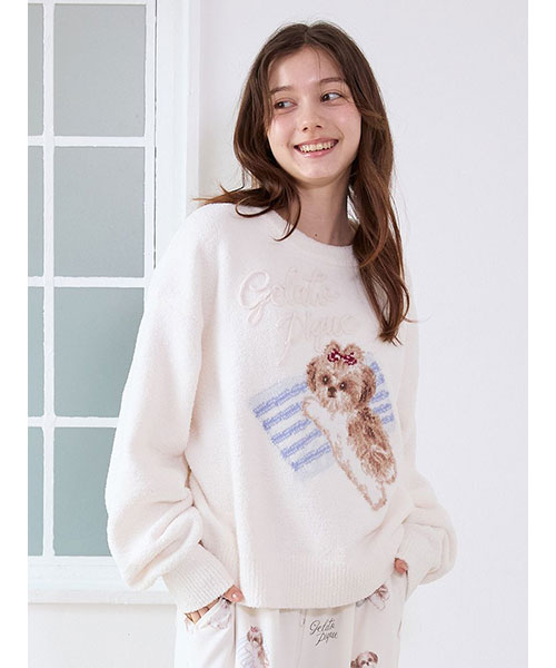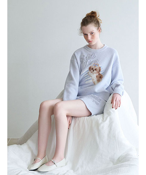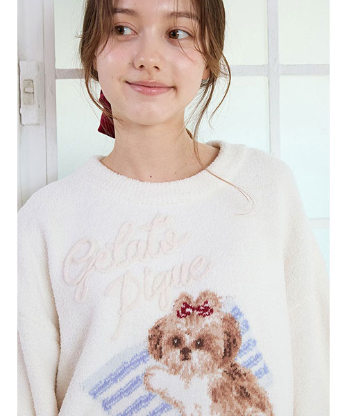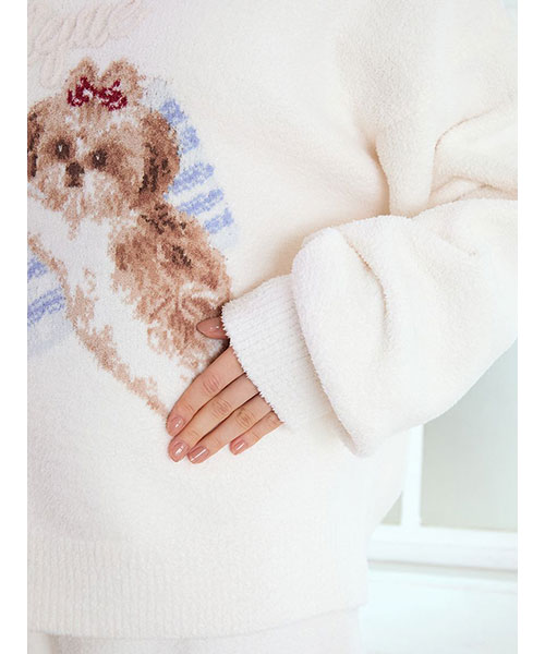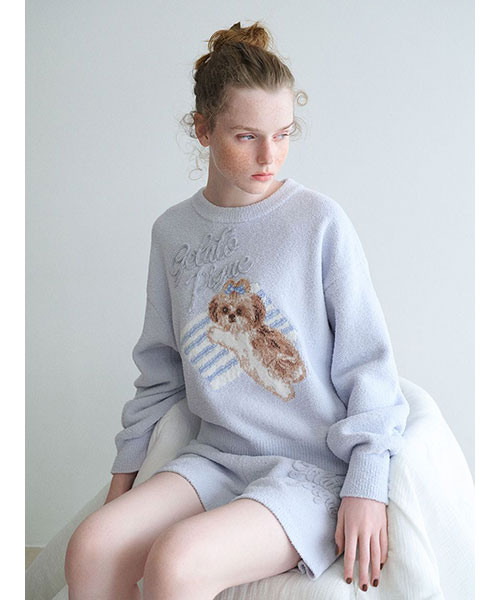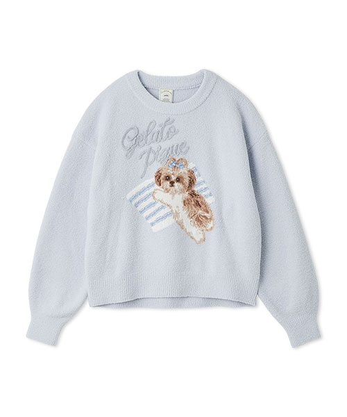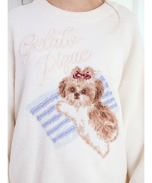 お気に入りの枕に寄り添うシーズー犬に癒される、ジャガードニットのシリーズです。ふんわりした風合いの絵柄に、ぷっくり立体的なロゴをあしらったプルオーバー。ボリューミーな袖もおしゃれな1枚です。リボンを付けたシーズーの絵柄は、ボディの配色によって枕の柄が異なるのもポイント。同シリーズのパンツを合わせたり、同時期に展開するシーズー柄カットソーのシリーズとのコーディネートもおすすめ。シーズー好きの方へのギフトにもおすすめのアイテムです。