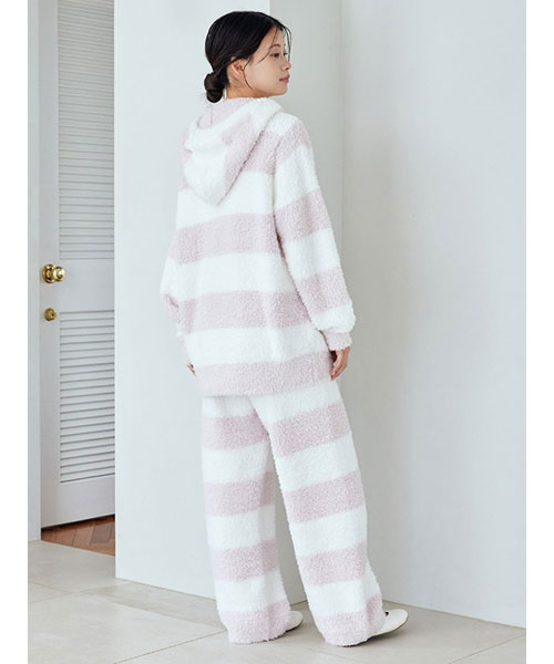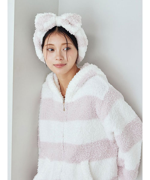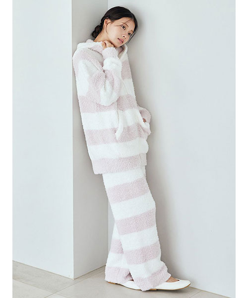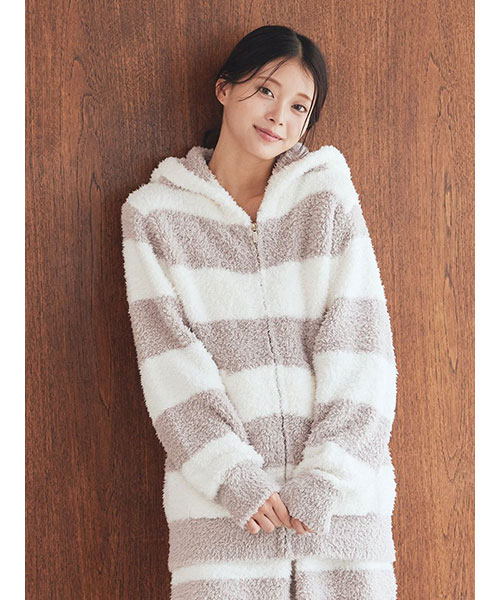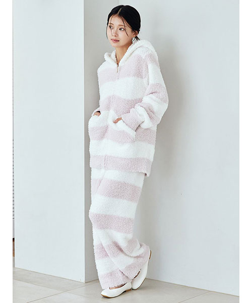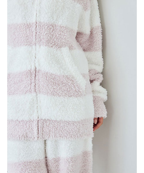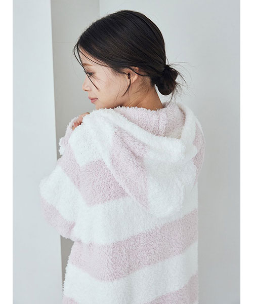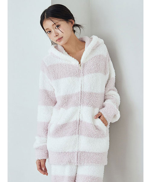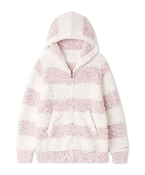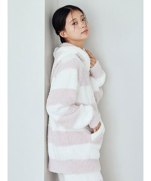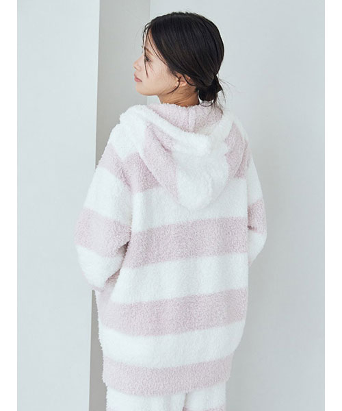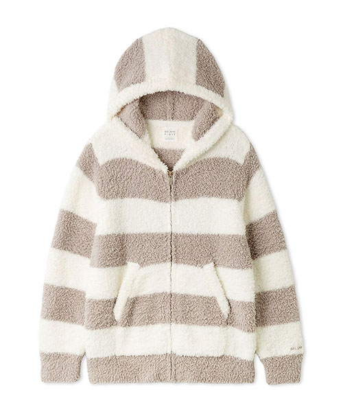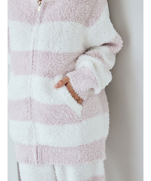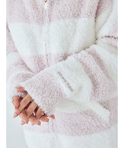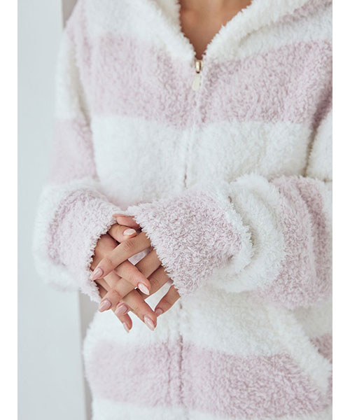 秋冬シーズンに似合うこっくりとした色合いで仕上げた、定番もこもこ素材‘ジェラート’の2色ボーダーシリーズです。ふんわりと羽織れるゆったりサイズのジップパーカは、春先まで長くお楽しみいただけるアイテム。左袖口にさりげなくロゴ刺繍が入っています。色はピンク、ブルー、モカの3色をご用意。同シリーズのロングパンツや小物と合わせてお楽しみください。