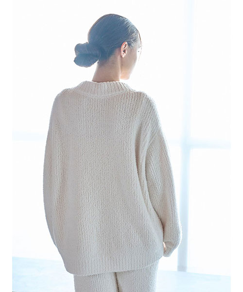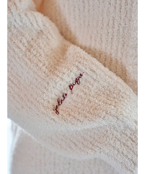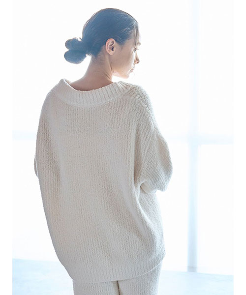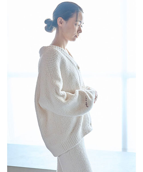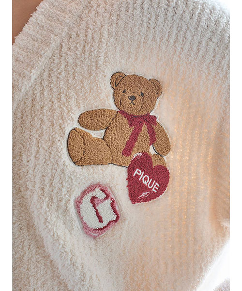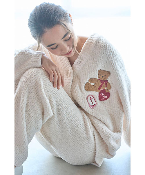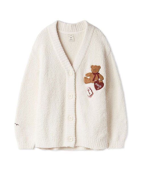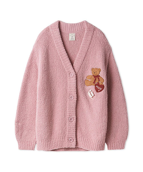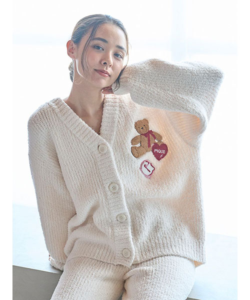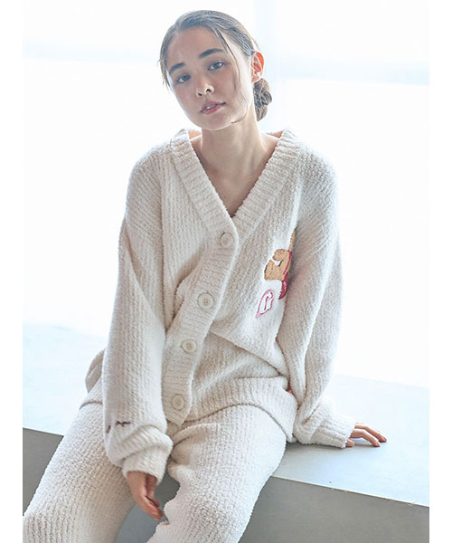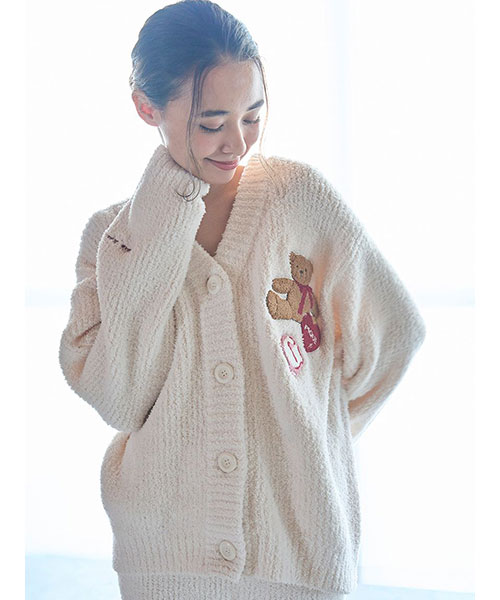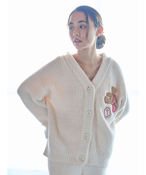 お気に入りのベアのぬいぐるみと暮らす、女の子のキュートなお部屋をイメージしたシリーズです。もっちり柔らかい‘ベビモコ’を畦編みにして使用したVネックのカーディガン。胸元にはベアのぬいぐるみとハートのクッション、雑誌から切り抜いたような『G』のサガラ刺繍が入っています。身幅はゆったりとさせつつも、やや短めの丈感でトレンドライクに着こなせるシルエット。色はアイボリー、ピンク、ネイビーの3色展開です。同シリーズのショートパンツやロングパンツに合わせたり、お揃いの柄を使用したフェイバリット柄シリーズとのコーディネートがおすすめ。
