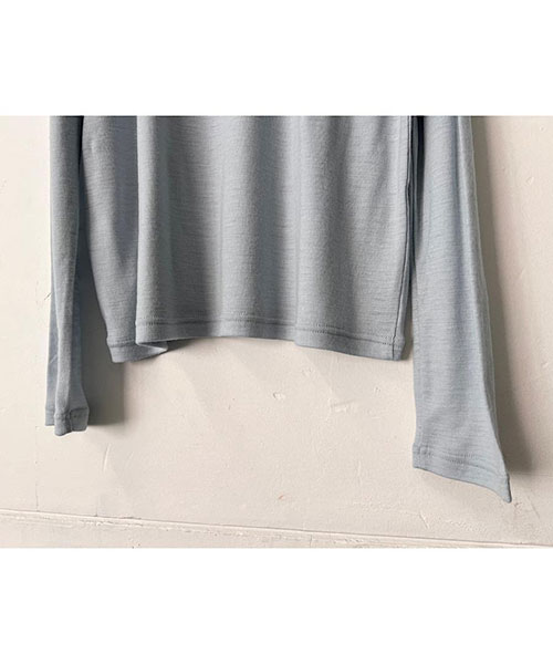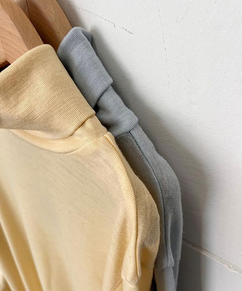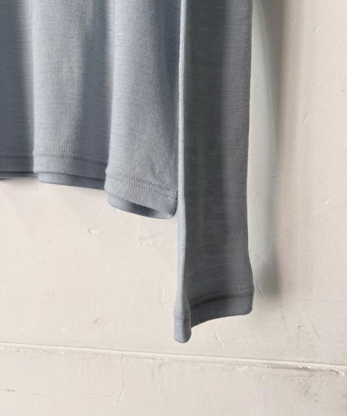 直径がとても細い繊維でできたウールを使用。滑らかな肌触りと上質な着心地が特徴で、上品な光沢が美しい生地感です。