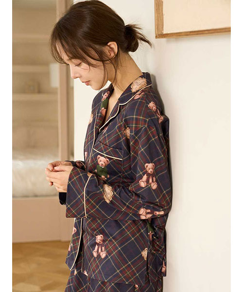 秋色チェック×ベアプリントの品のある開襟シャツ【Design/Styling】