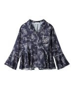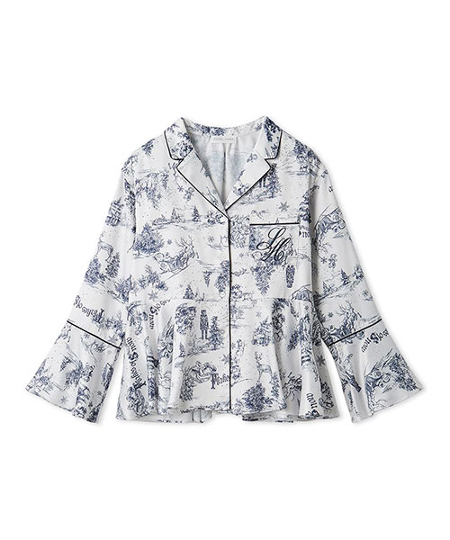 襟元や袖口にプリント柄と同色のパイピングを入れ、胸ポケットにはSNIDEL HOMEのイニシャルロゴを刺繍。