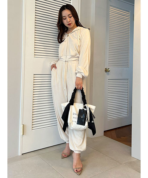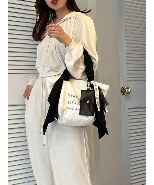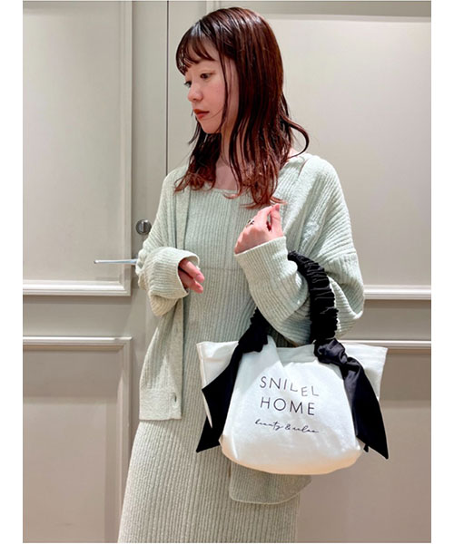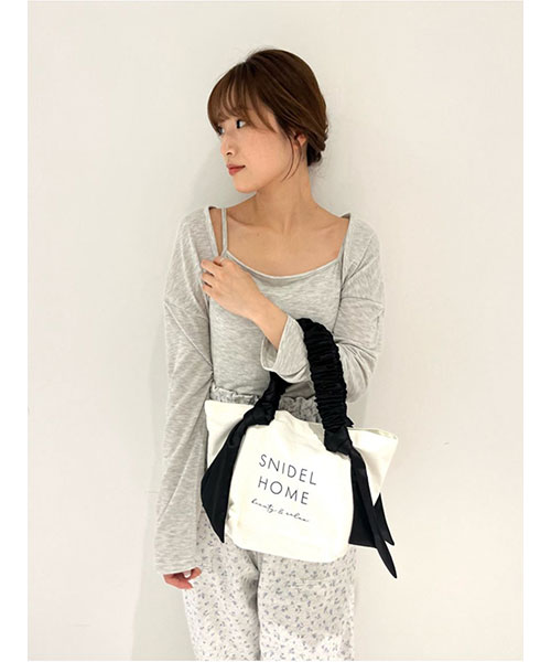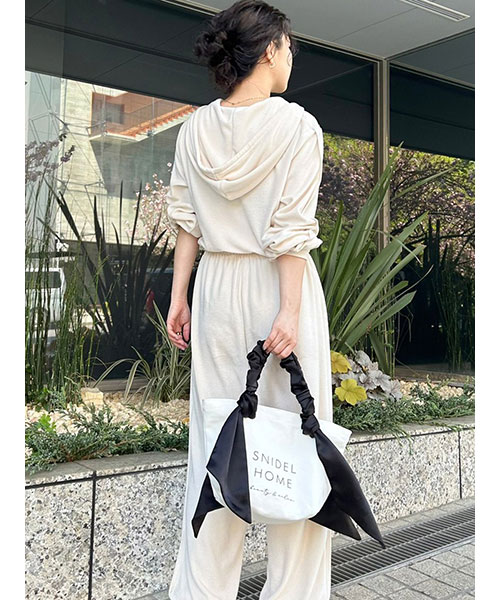 ギャザーを寄せた持ち手や大きなリボンで個性を出し、カジュアルな素材ながらデイリーに取り入れてもラフすぎない、女性らしさと品の良さが楽しめます。