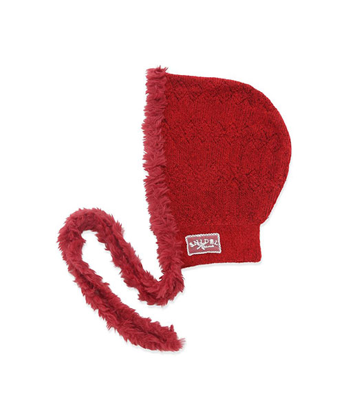 シャギーなリボンを付けた、ボンネットタイプのニット帽子です。