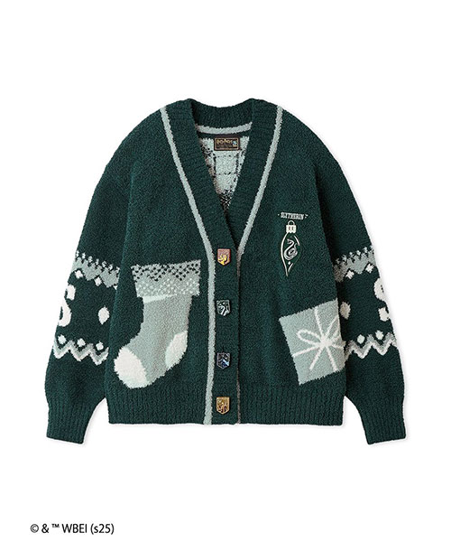 フロントに入れた大きなソックスやギフトBOX、背面に入れたクリスマスリース風のジャガードが、ホリデーシーズンのHAPPYな気分を演出するカーディガン。