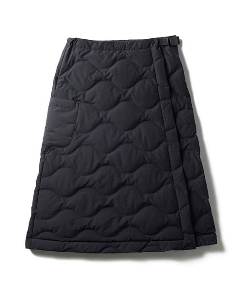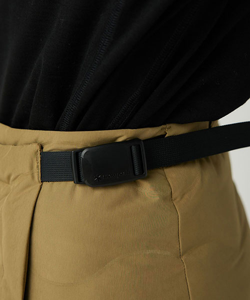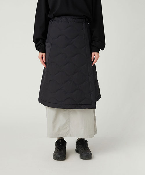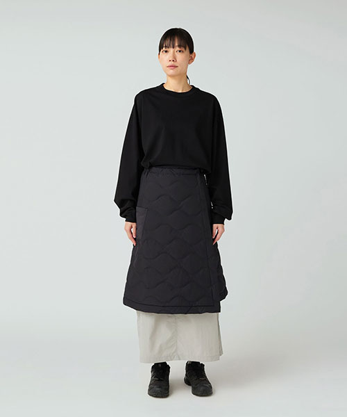 秋冬のキャンプシーンなどで急に気温が下がったときに、上から重ねて着用のできるオーバーラップスカートです。パンツにもスカートにも重ねられて、個性豊かなレイヤリングが楽しめる一着。また単体での着用時にもズレないよう、内側をファスナーで固定できるようにしました。ウエストはロゴ入りバックル付きのテープで調整可能です。ちょっとしたときにスマートフォンやハンカチを入れられるよう、右脇のみパッチポケットをあしらいました。