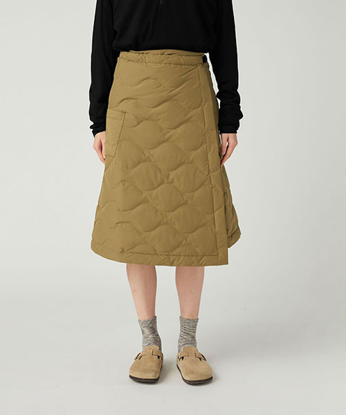 秋冬のキャンプシーンなどで急に気温が下がったときに、上から重ねて着用のできるオーバーラップスカートです。パンツにもスカートにも重ねられて、個性豊かなレイヤリングが楽しめる一着。また単体での着用時にもズレないよう、内側をファスナーで固定できるようにしました。ウエストはロゴ入りバックル付きのテープで調整可能です。ちょっとしたときにスマートフォンやハンカチを入れられるよう、右脇のみパッチポケットをあしらいました。