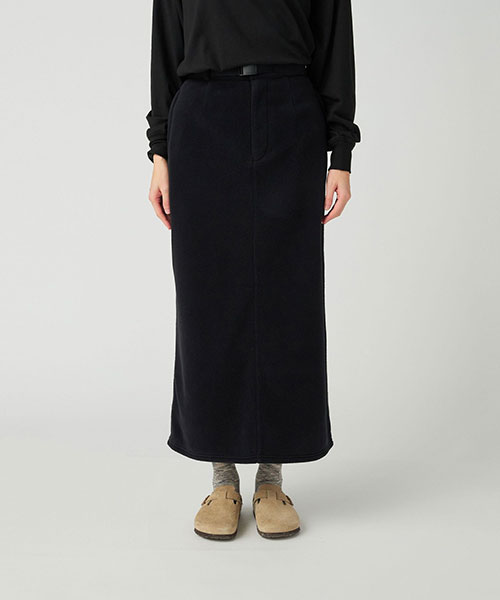 撥水加工を施したフリース素材を使用したロングスカート。柔らかな生地感で動きやすく、後ろ中心のベントが足さばきをサポートします。ウエストはロゴ入りバックルでサイズ調整が可能。脇にはファスナー付きポケットを配置し、座ったときの収納物の落下を防止。右後ろにはパッチポケットも備えています。タイトなシルエットなので、秋冬のボリューム感のあるトップスともバランスよく合わせられます。