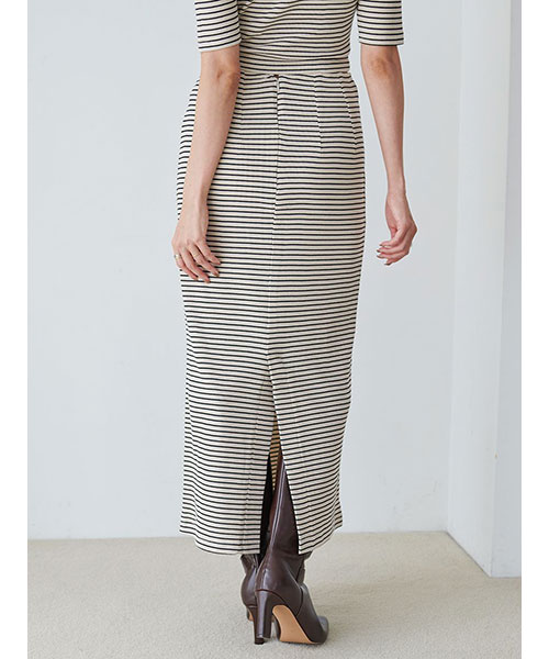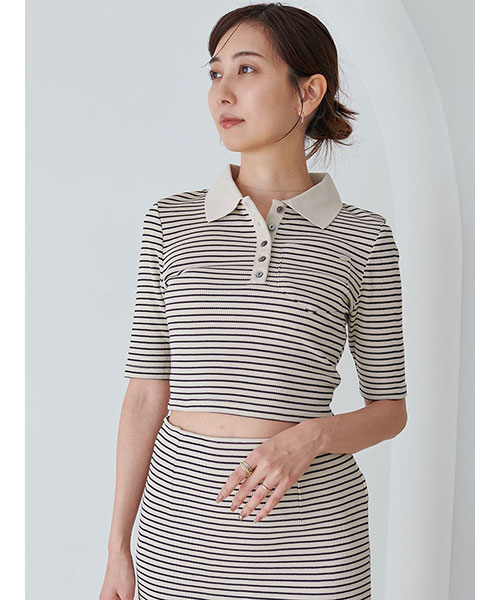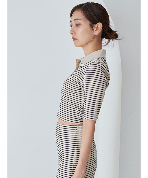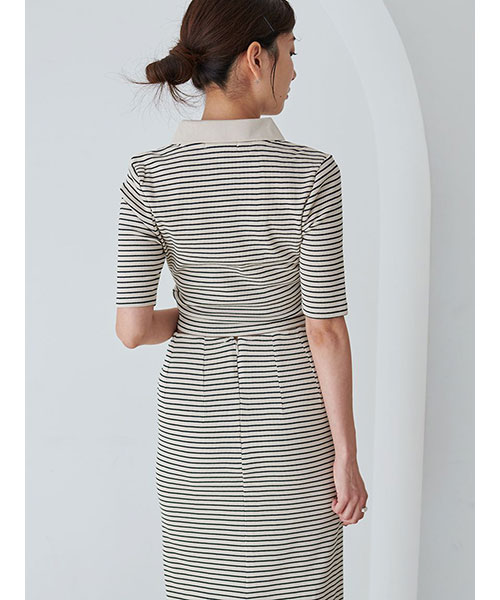 表面感のあるワッフル素材を使用したポロトップスと、同素材で仕立てたIラインスカートのセットアップ。トップスは衿と前立てに別編みの生地を使用し、胸ポケットをアクセントにしたこだわりのデザイン。ひじ上丈の袖と程よいゆとりのあるサイズ感で、抜け感のあるシルエットを演出します。スカートはIラインシルエットに深めのベンツを入れることで、上品さと動きやすさを兼ね備えた仕上がりに。オフィスにもデイリーにも活躍する万能なアイテムです。